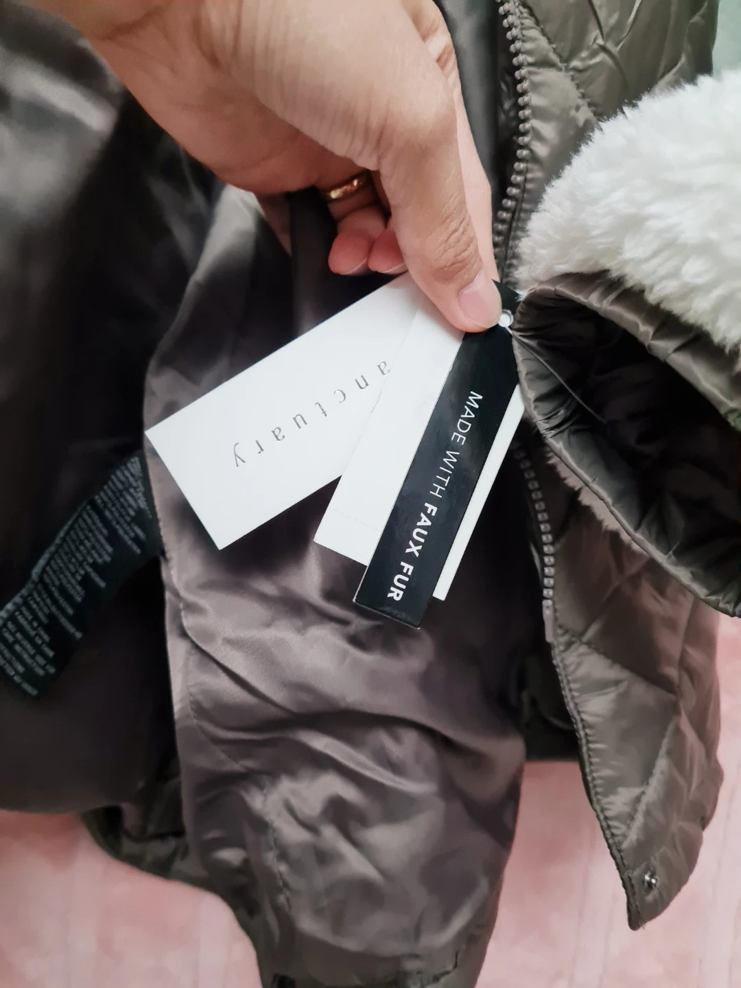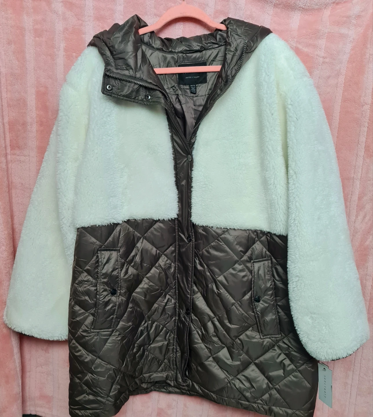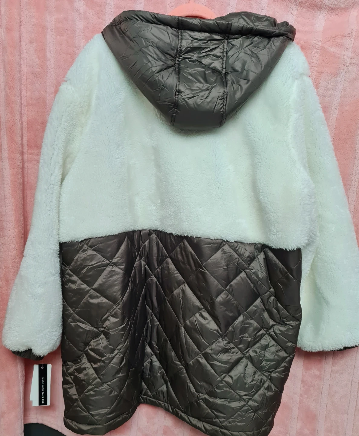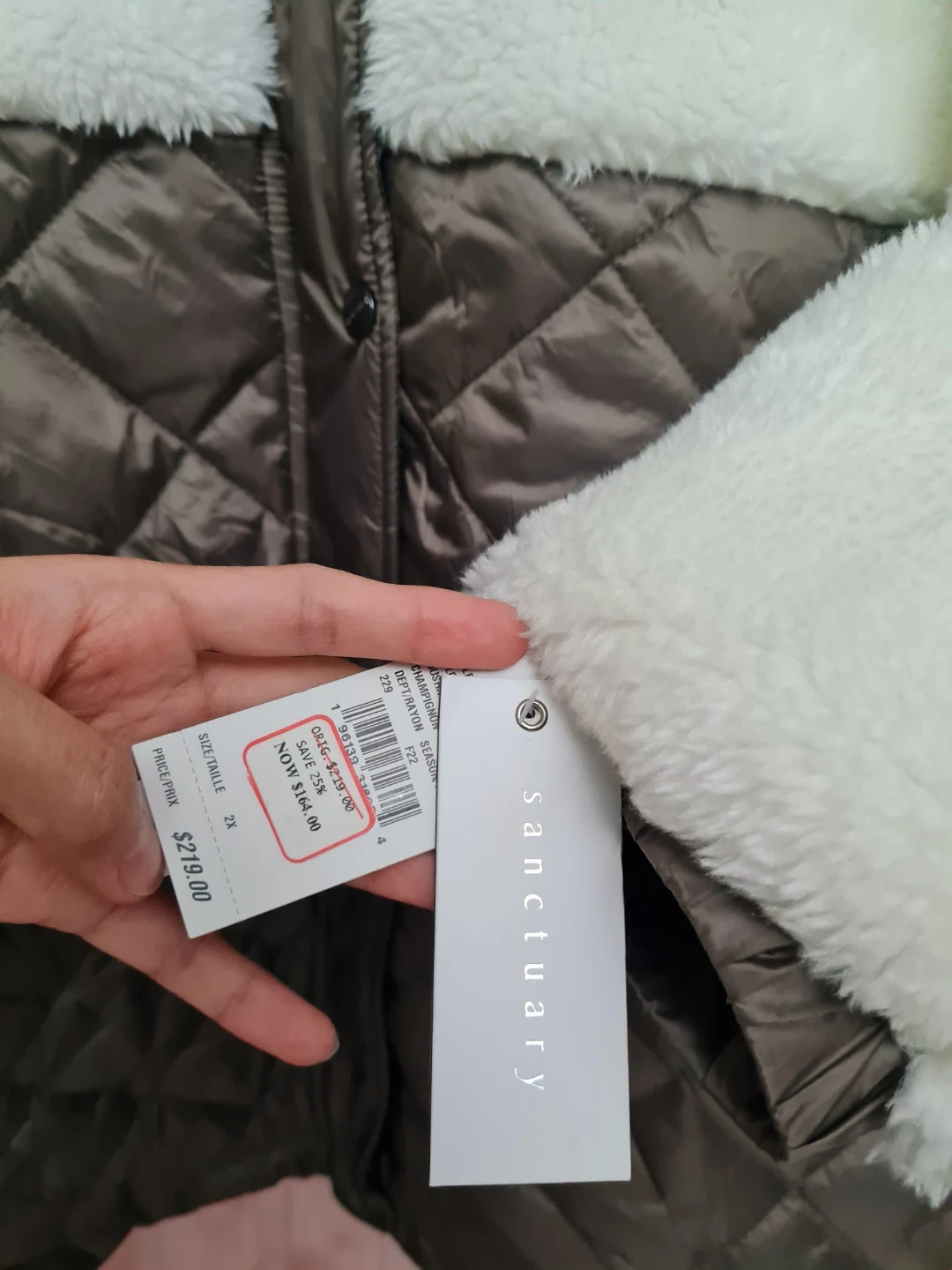 19Brand new with tag, larger-size jackets suitable for the coming season. Cozy Sanctuary hooded jacket in size 2X! It features a stylish combination of white Faux Fur and brown quilted fabric. Originally bought for $219.00
