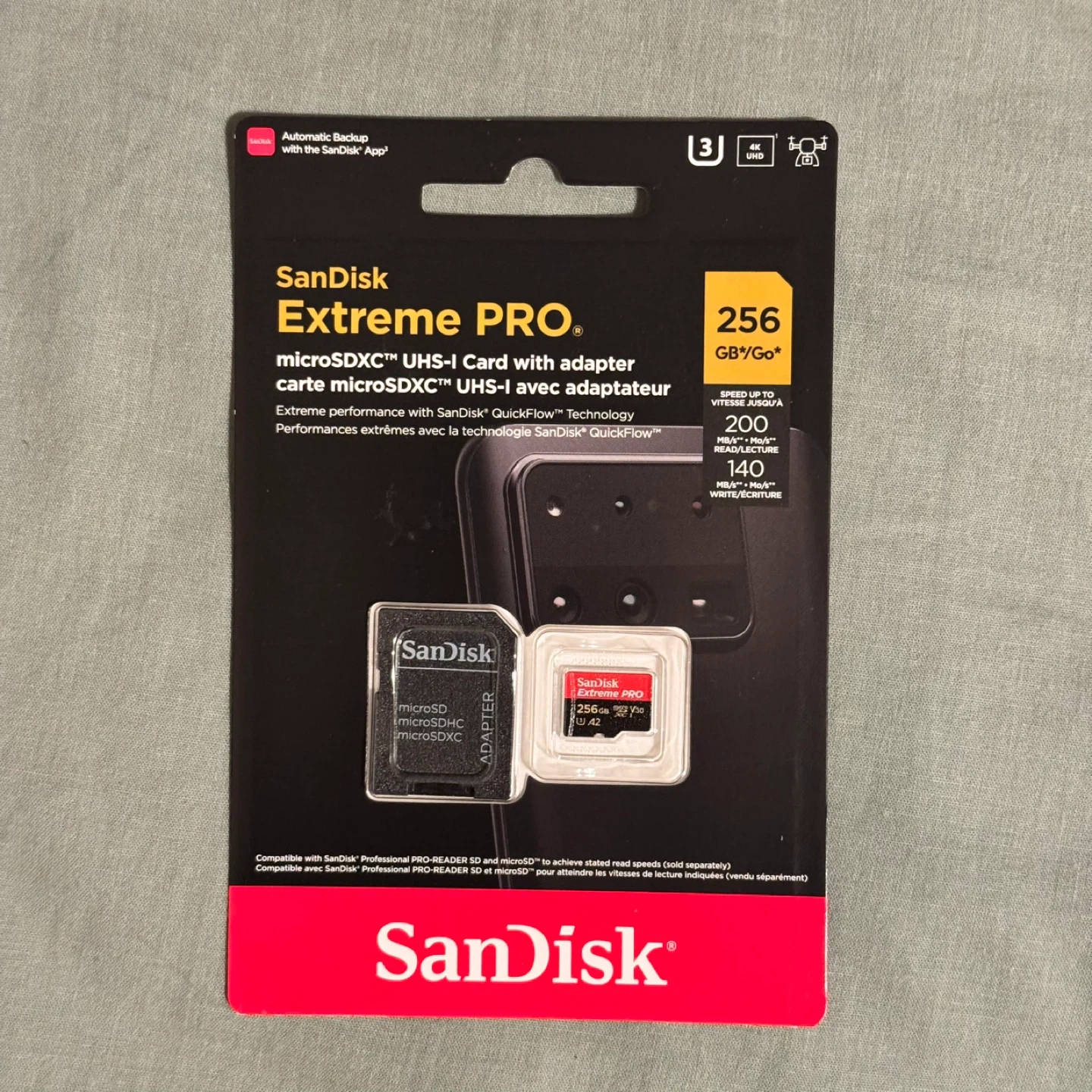 65Selling a SanDisk Extreme PRO microSDXC UHS-I Card with adapter. - 256 GB storage capacity - Up to 200 MB/s read speed - Up to 140 MB/s write speed Great for smartphones, tablets, and cameras in 4K/UHD resolutions! SDXC/microSDXC/U3/V30/A2/UHS-I