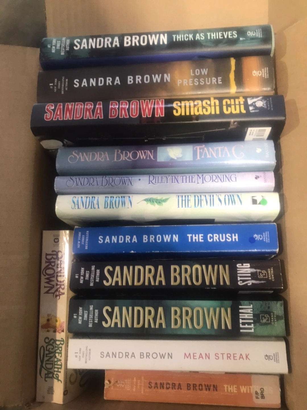 Selling a collection of 15. books by Sandra Brown. Titles include: - Thick as Thieves - Low Pressure - Smash Cut - Fanta C - Riley in the Morning - The Devil's Own - The Crush - Sting - Lethal - Mean Streak - The Witness - Breath of Scandal No holds FCFS x posted Cash and pickup only Price is for all of them together