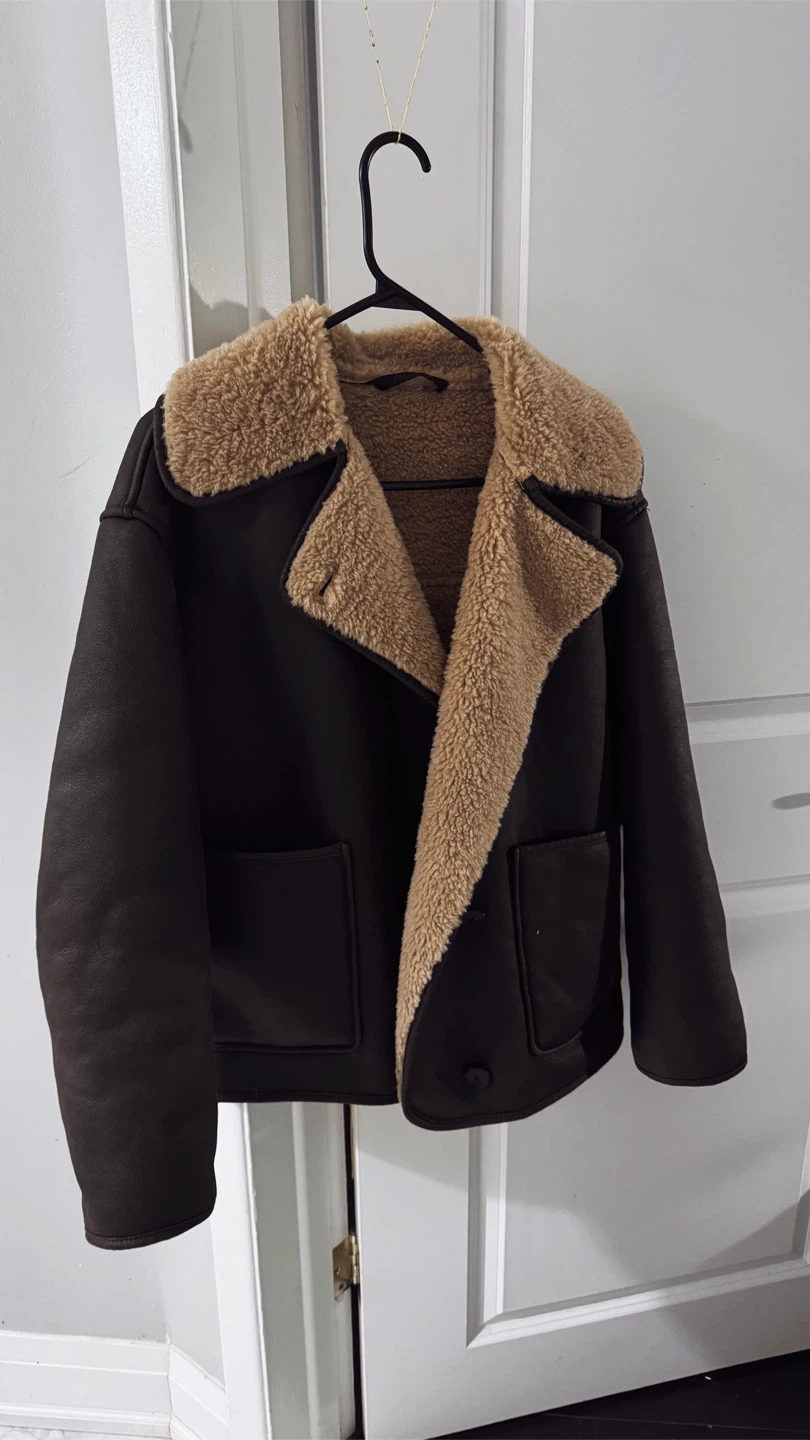 Brown faux leather jacket with a cozy faux shearling lining and collar. It's a stylish and warm outerwear piece perfect for cooler weather.