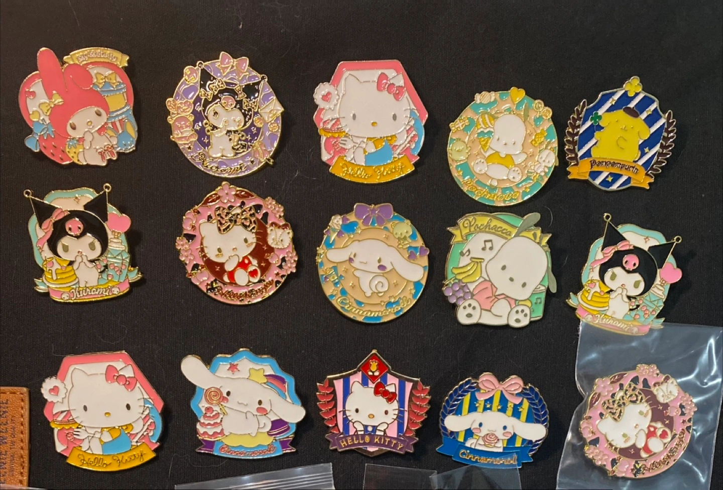 Selling a collection of super cute Sanrio character enamel pins! Each for 4 dollars. You'll find Hello Kitty, Kuromi, Cinnamoroll, Pochacco, My Melody, and Pom Pom Purin. Perfect for adding some kawaii flair to your bag, jacket, or pin board