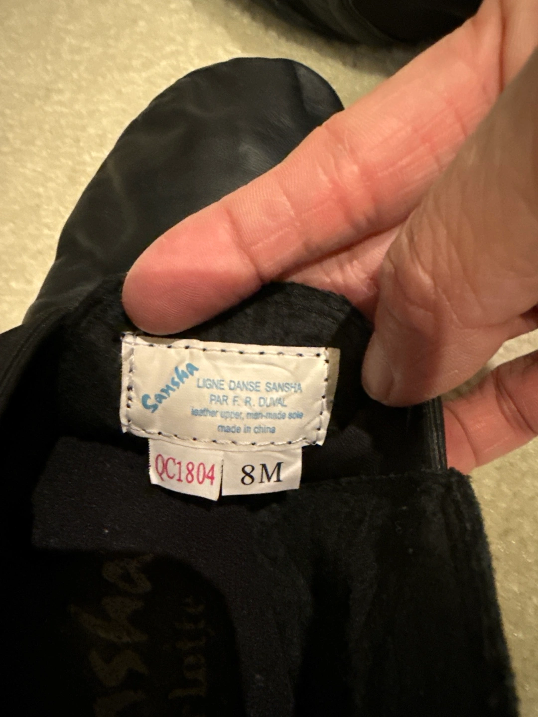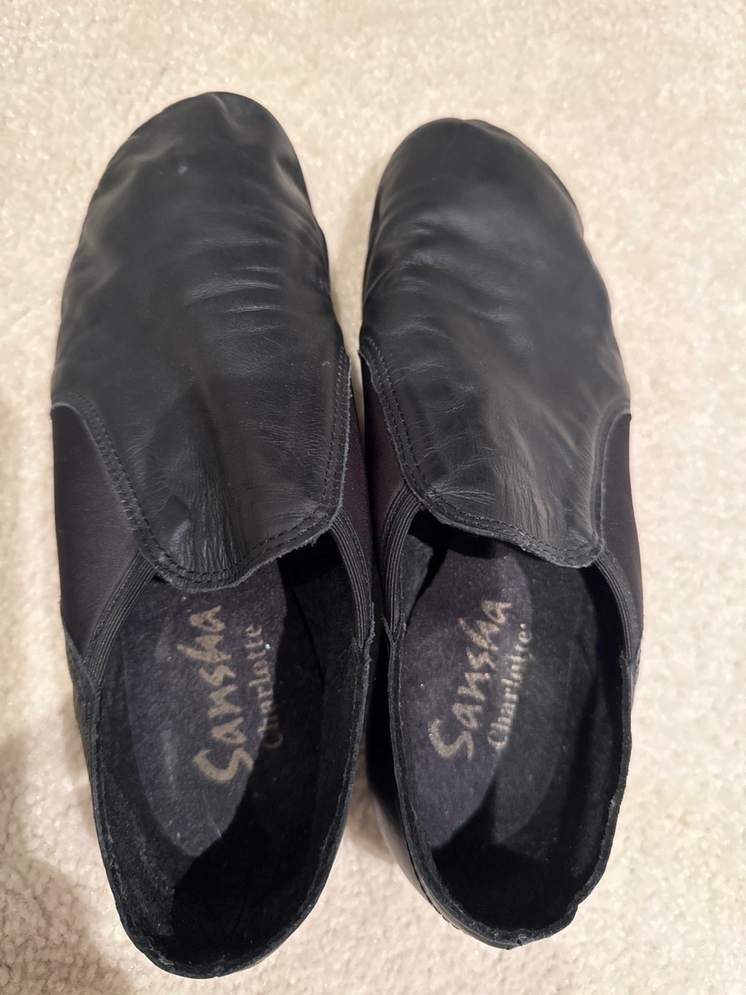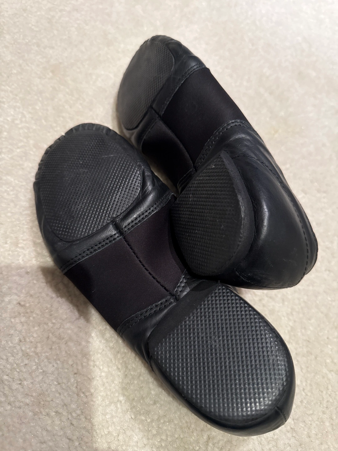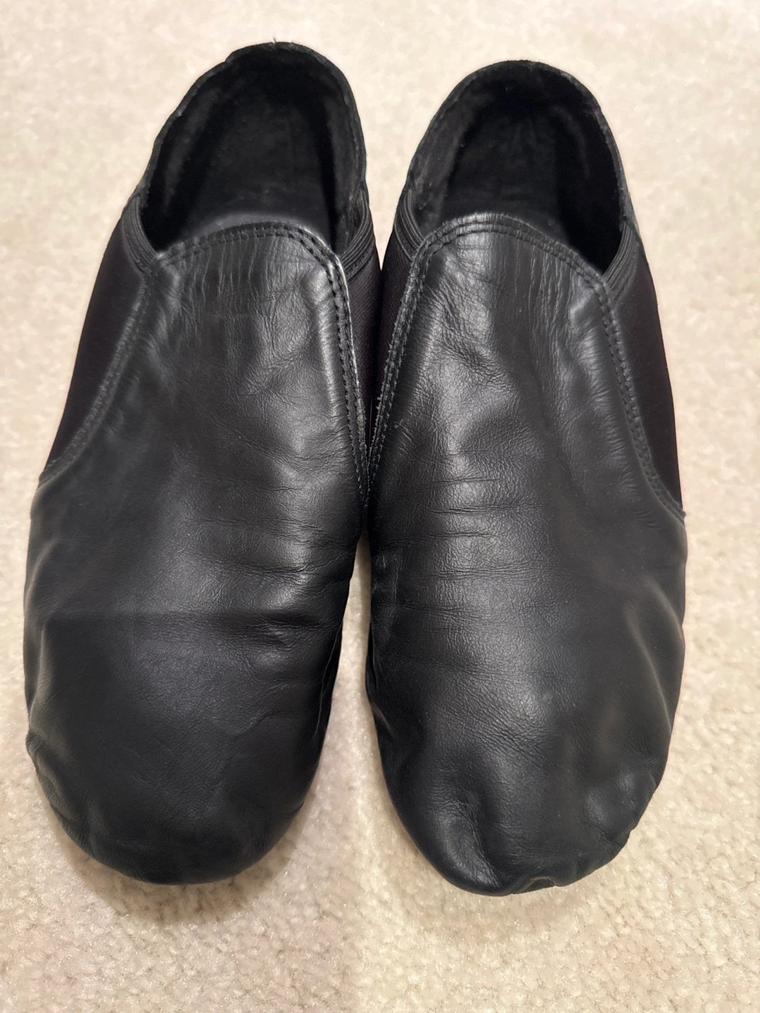 26Black leather dance/Jazz shoes, size 8M. Slip-on style with a rubber sole. Gentle used I have 2 pairs and each $39