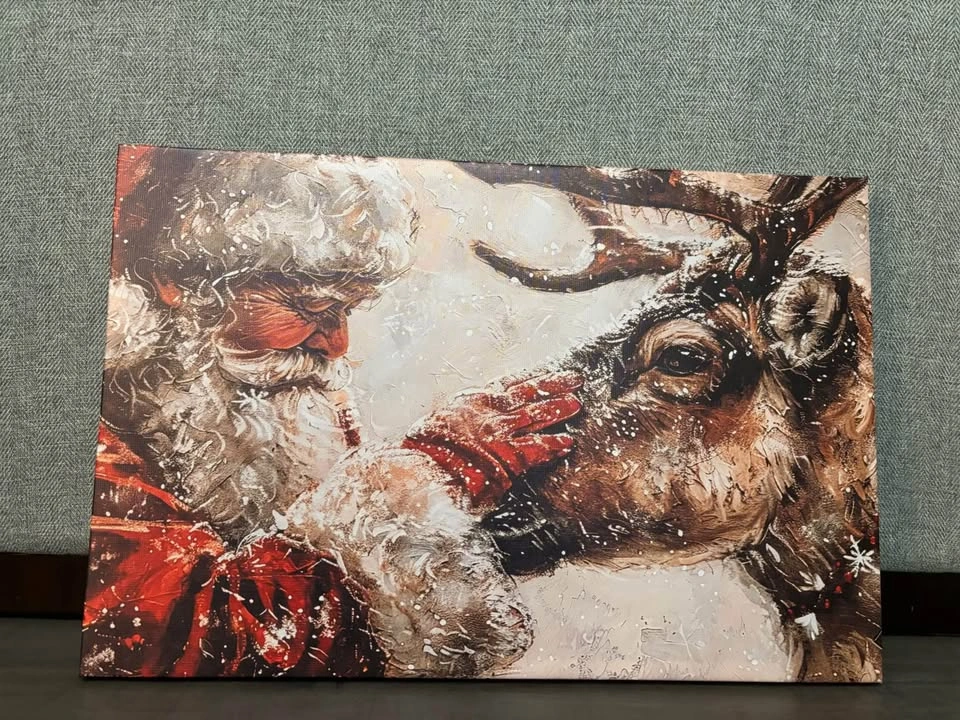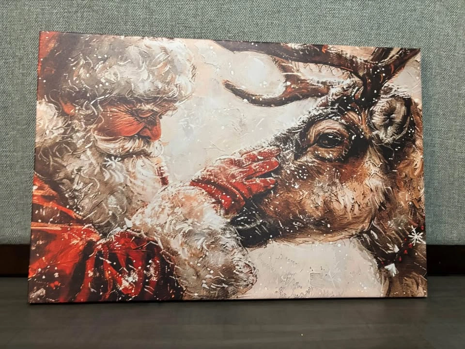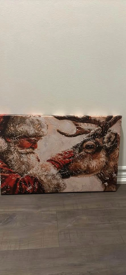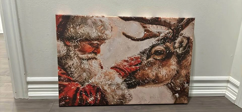 10Santa and his reindeer print on canvas. Framed onto 19.6x11.7”x1.5” wooden frame. Pick up in Bowmanville, near Northglen and middle Rd. Check out my other listings for more selection!!