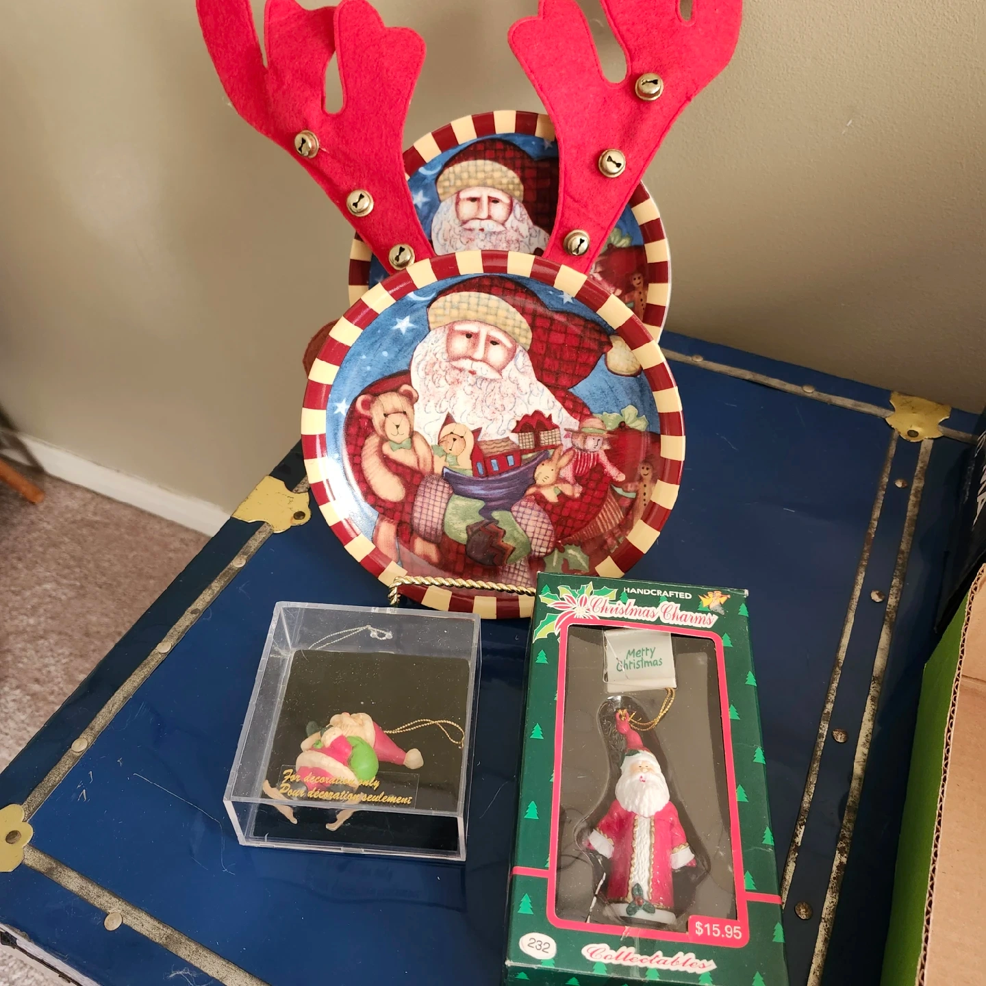 2402 Christmas plates with Santa and 2 Christmas Charms Santa ornaments. Includes a set of Reindeer antlets. Perfect for adding some festive cheer to your home!