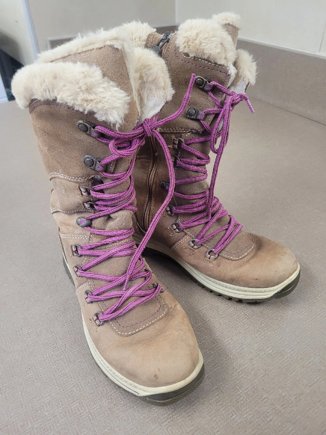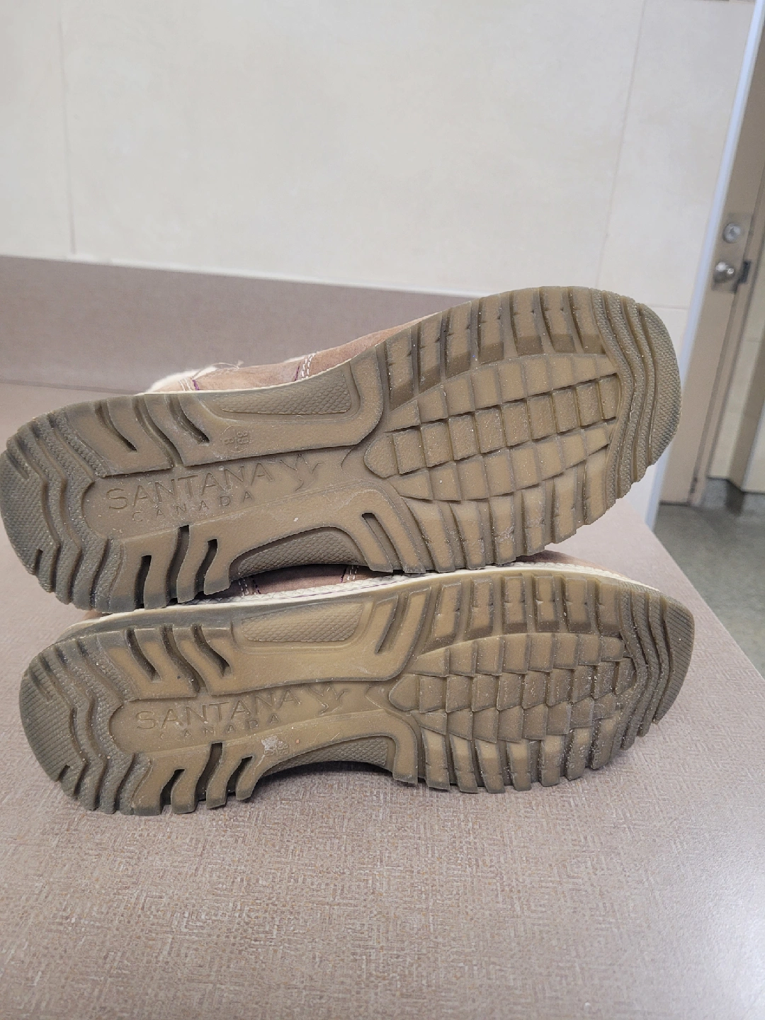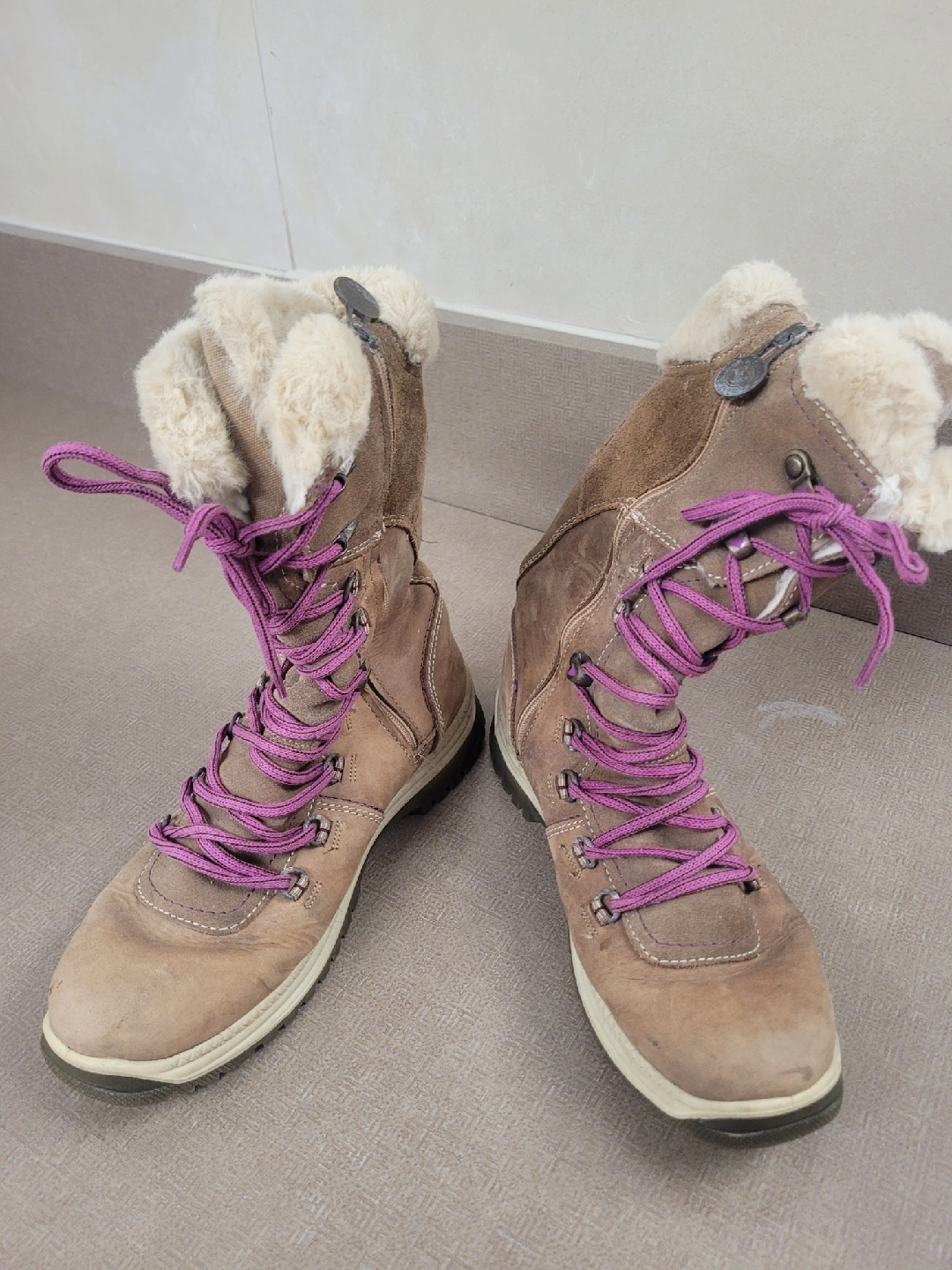 Keep your feet warm and stylish with these Santana Canada weatherproof winter boots! They feature a cozy faux fur trim and durable construction, perfect for braving the Canadian winters. The boots have a lace-up design with purple laces for a secure fit and a rugged outsole for traction on slippery surfaces