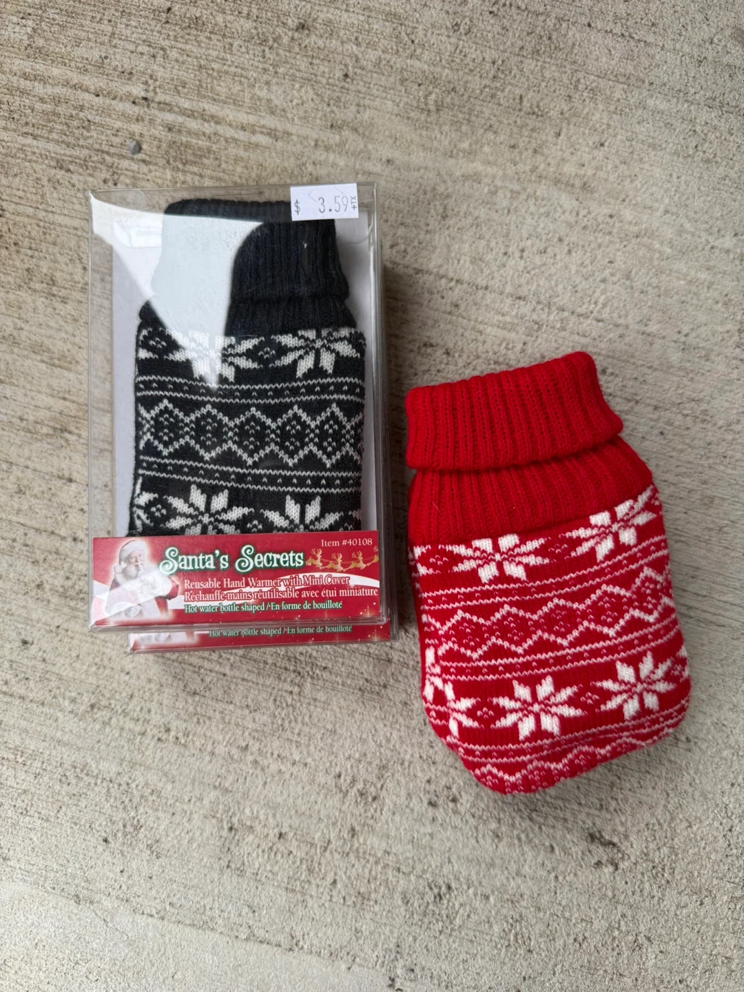 75Selling a Santa's Secrets reusable hand warmer with a mini cover. It's hot water bottle shaped and comes in either black or red with a festive snowflake design. It's still in its original packaging! $2.00 each