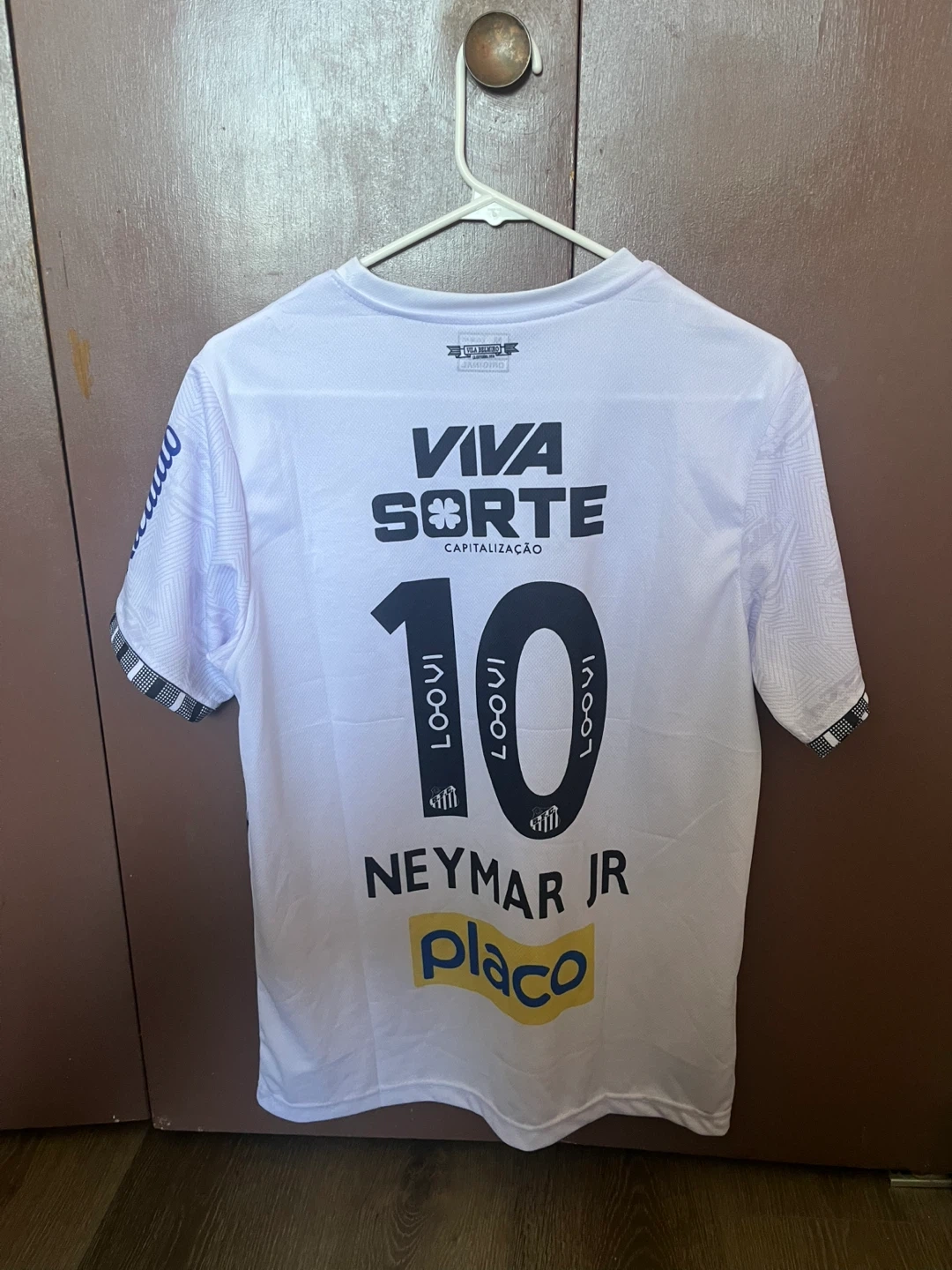 Selling a Santos FC jersey featuring Neymar Jr's name and number 10. It's a size M and in great condition. The jersey has a slim fit and is an original design. Perfect for any Santos FC or Neymar fan!