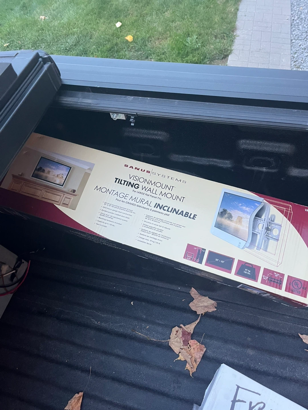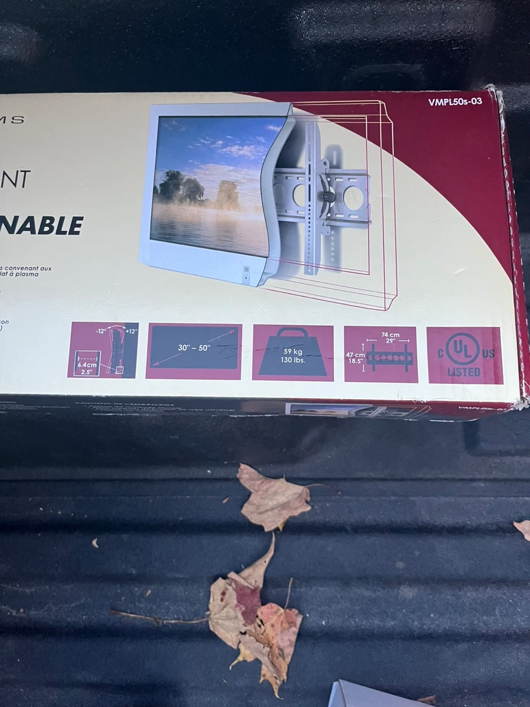 Selling a Sanus VisionMount Tilting Wall Mount, suitable for TVs ranging from 30 to 50 inches. It supports up to 59 kg (130 lbs). The box includes all the necessary components for installation. It allows for a tilt of +12° / -12° and has a depth of 6.4 cm (2.5 inches).
