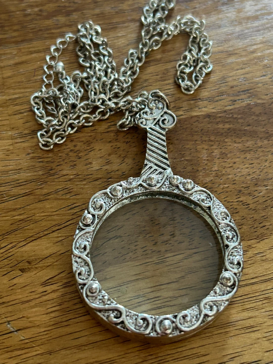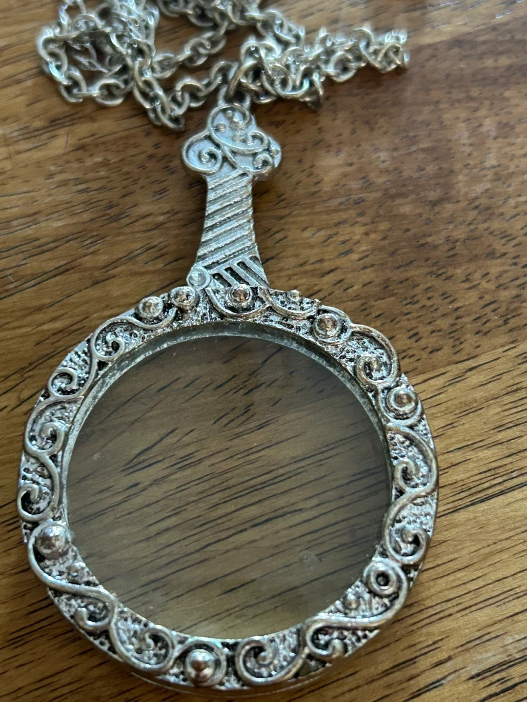 Selling a vintage silver magnifying glass necklace! It's a unique piece with a detailed design on the magnifying glass frame and chain. A stylish and functional accessory!