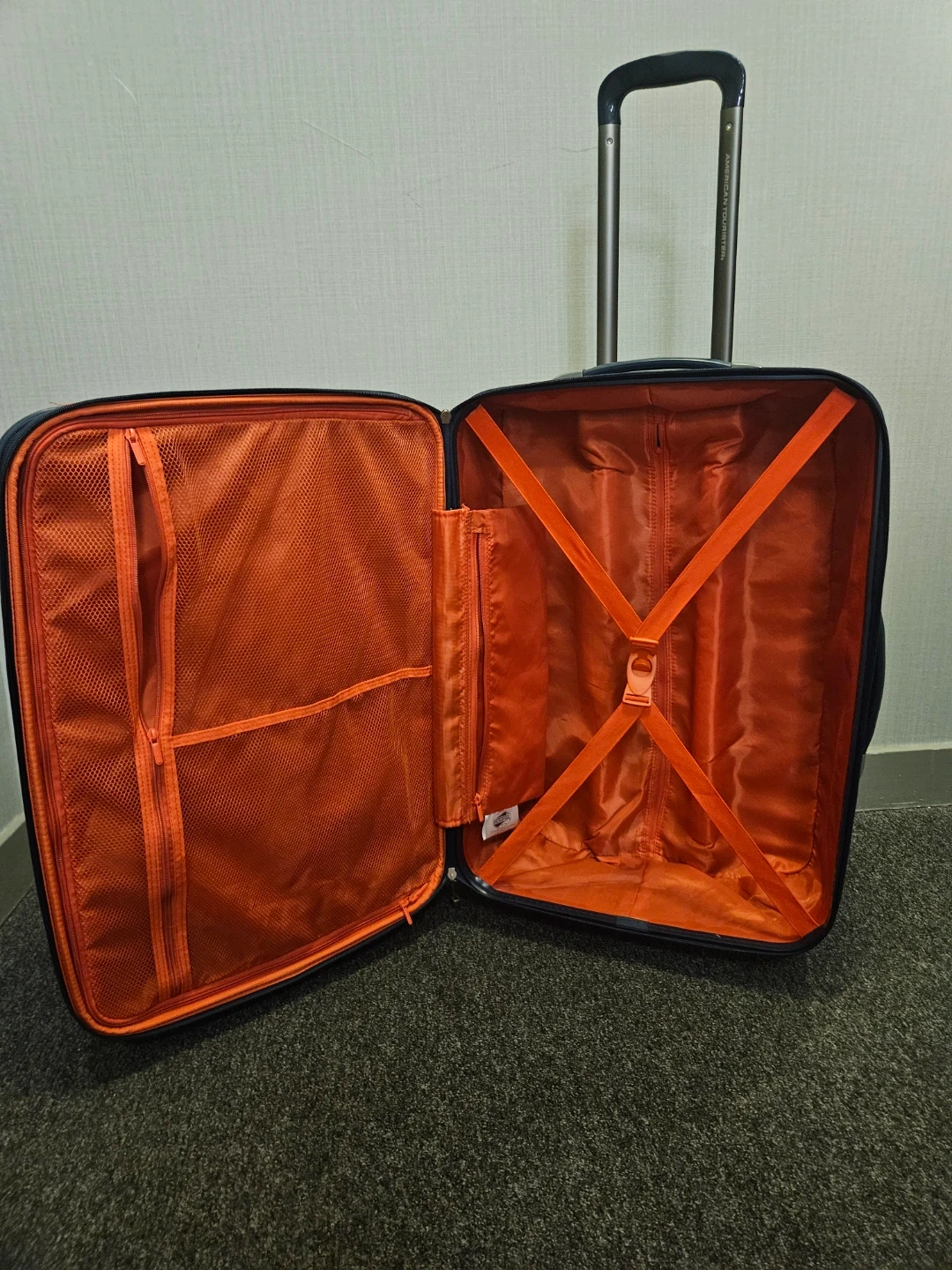 Dark navy blue hardshell Carry- On, Expandable suitcase with a retractable handle and wheels. Interior has orange lining and straps. Includes built-in lock.