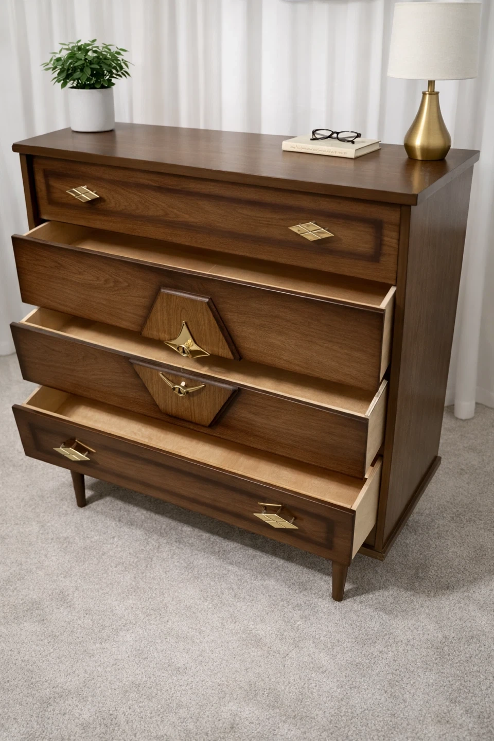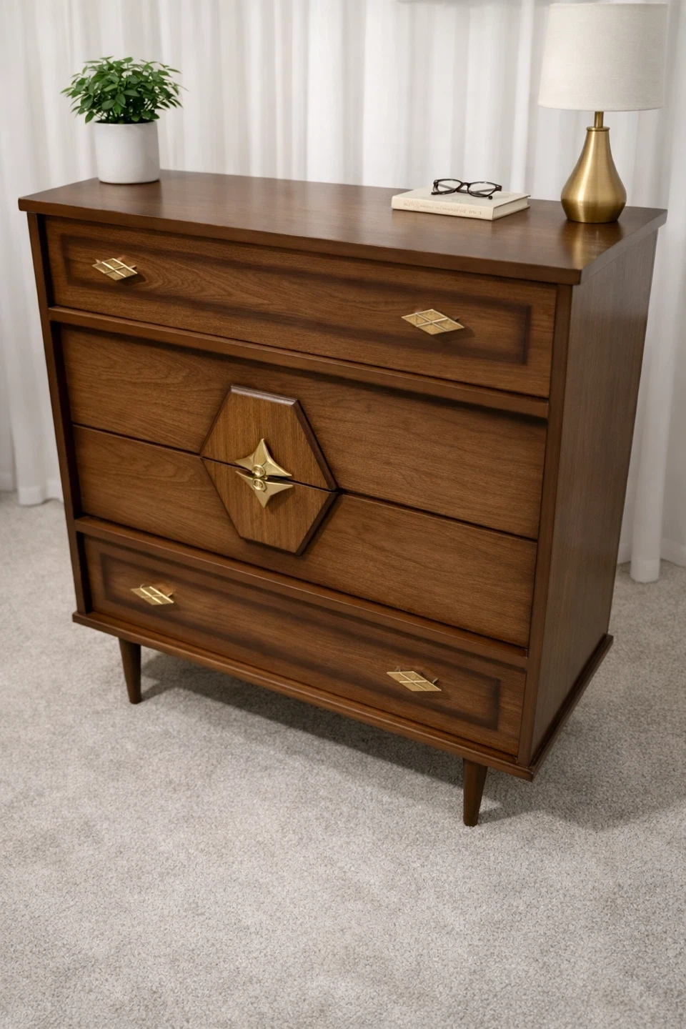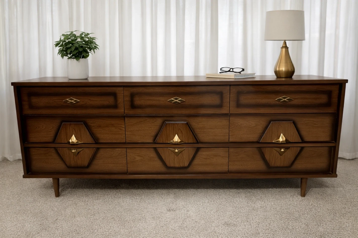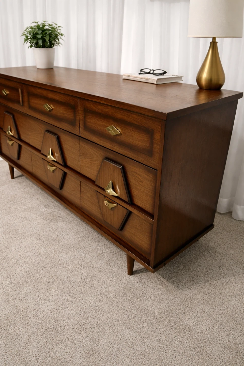 Elevate your bedroom with this striking vintage mid-century modern dresser set, featuring a nine-drawer long dresser and a four-drawer chest, both showcasing exquisite wood grain and unique starburst hardware. This set is used and has some minor wear, but is still in great condition.