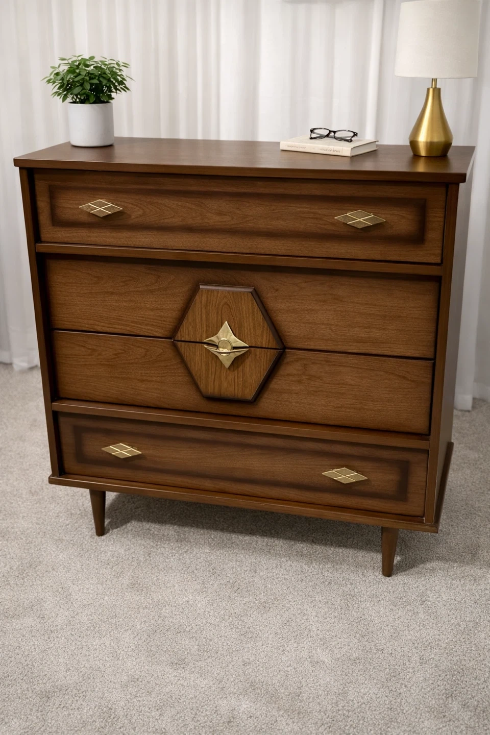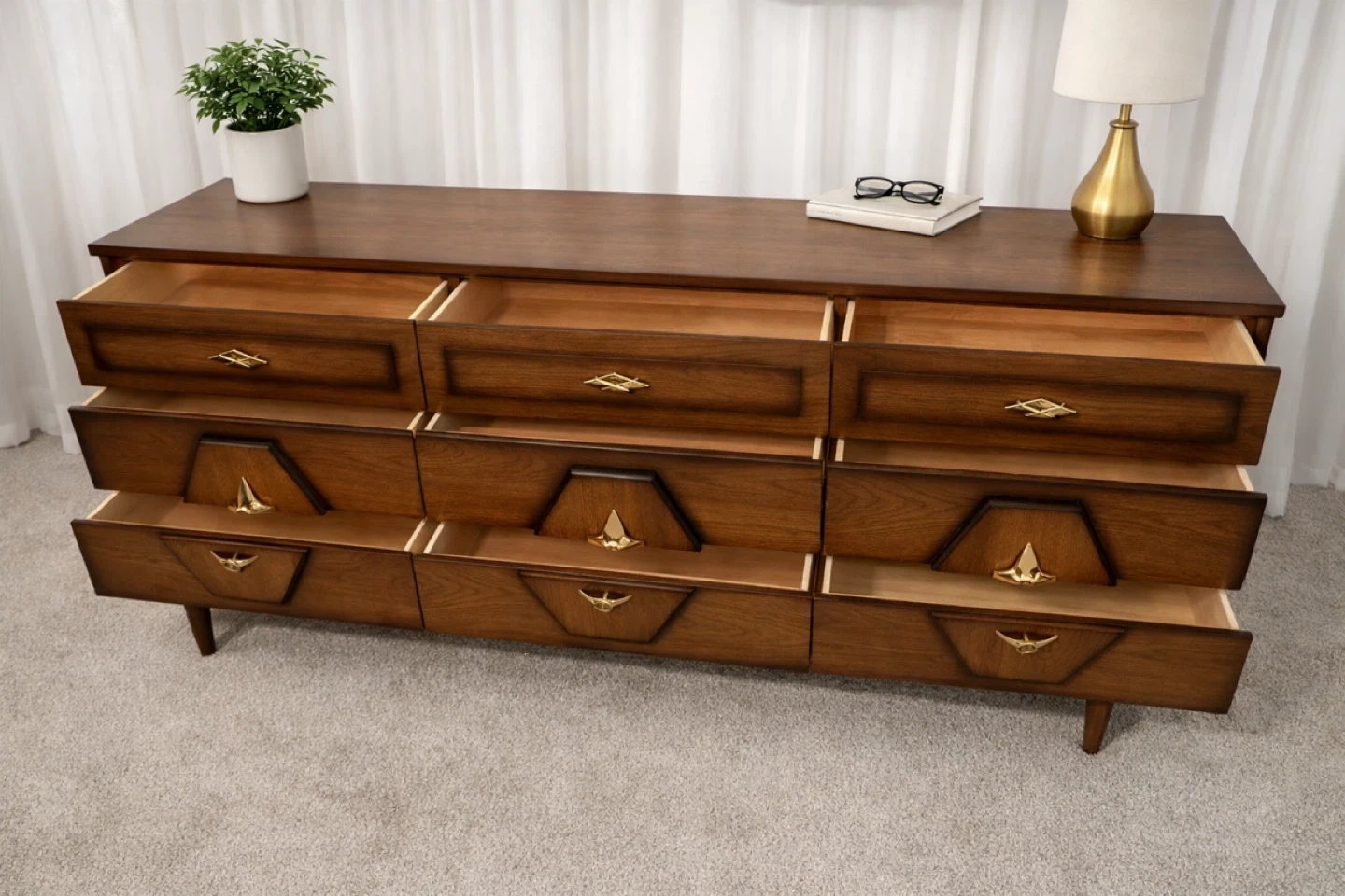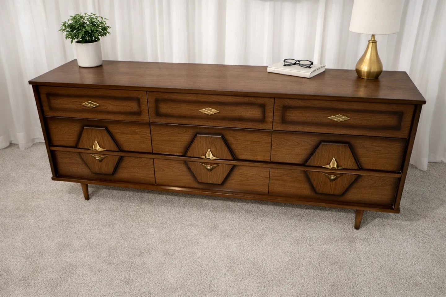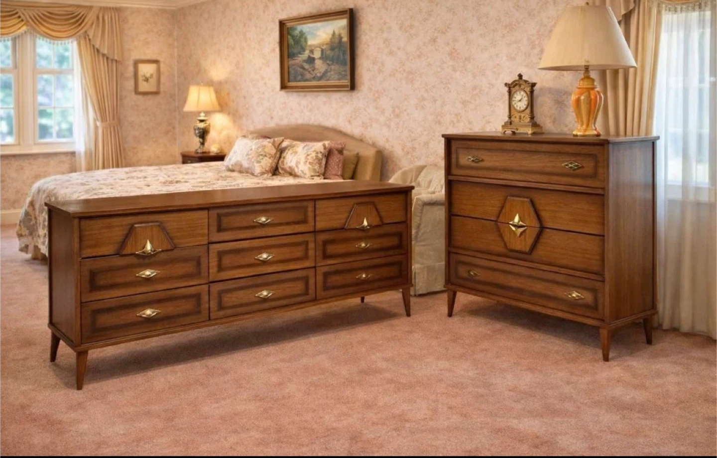 Elevate your bedroom with this striking vintage mid-century modern dresser set, featuring a nine-drawer long dresser and a four-drawer chest, both showcasing exquisite wood grain and unique starburst hardware. This set is used and has some minor wear, but is still in great condition.