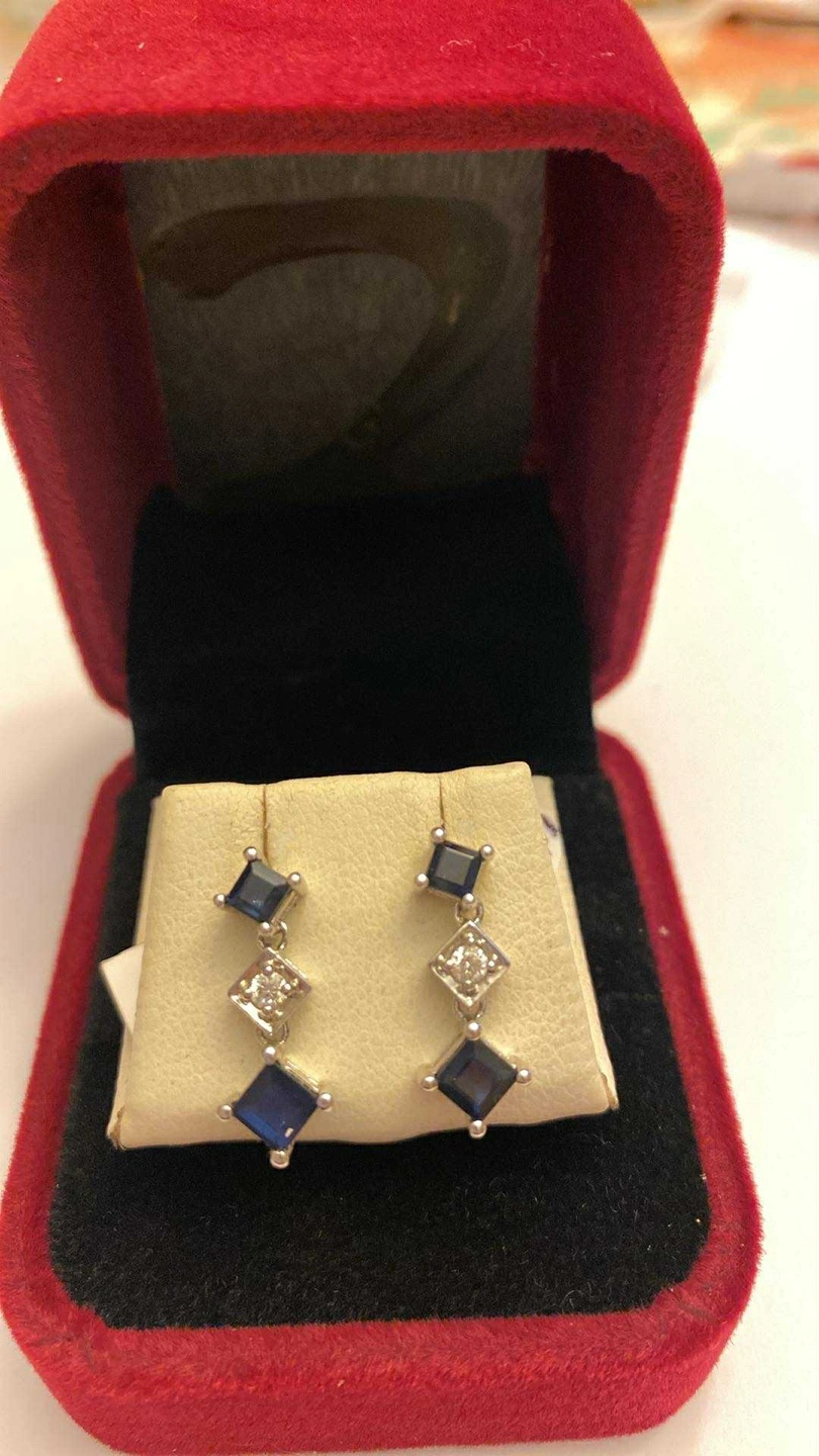 96Here are some beautiful dangle earrings featuring sapphire and diamond stones. They come in a red velvet box, perfect for gifting or keeping them safe. 14k white gold real blue sapphire and diamonds