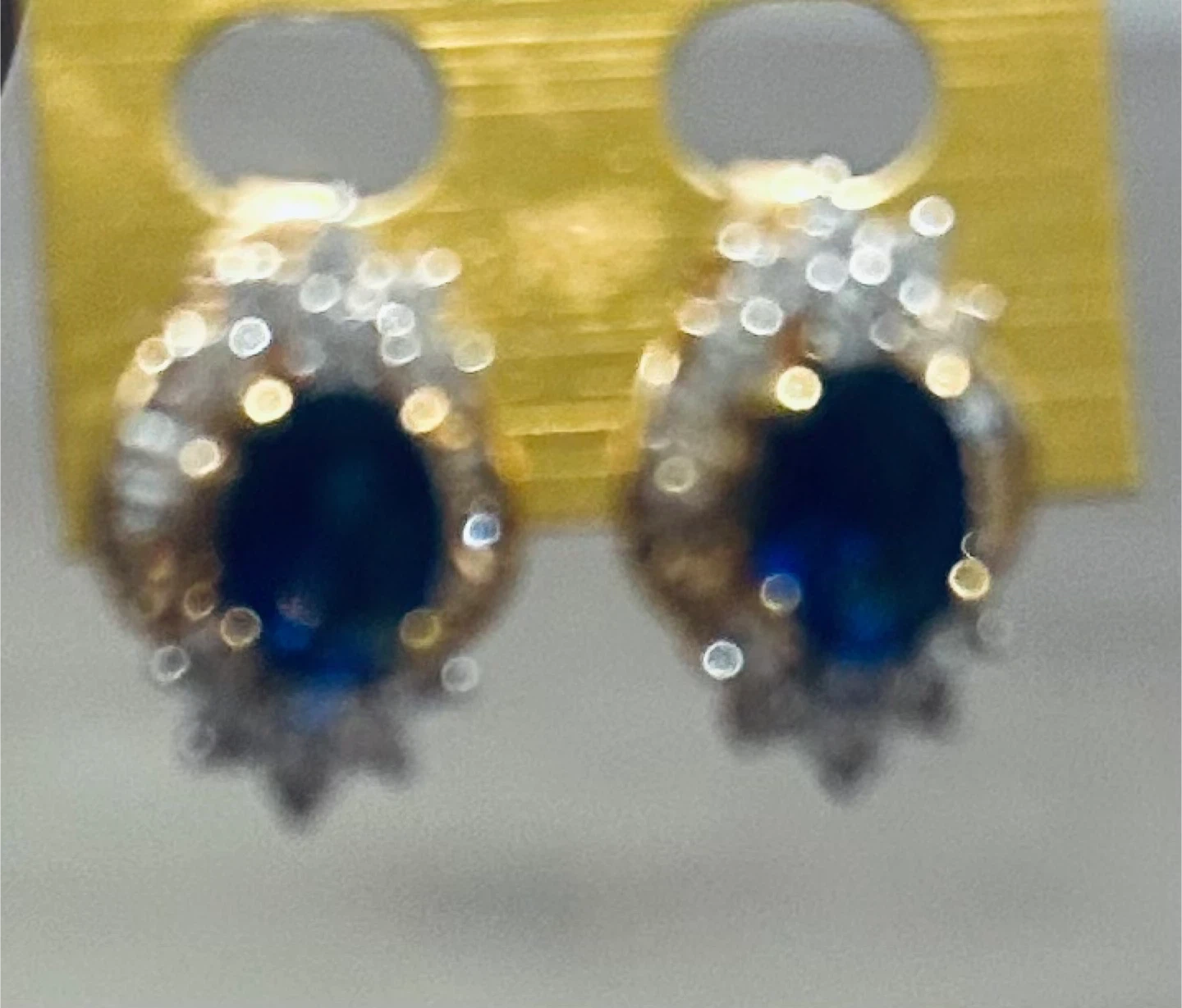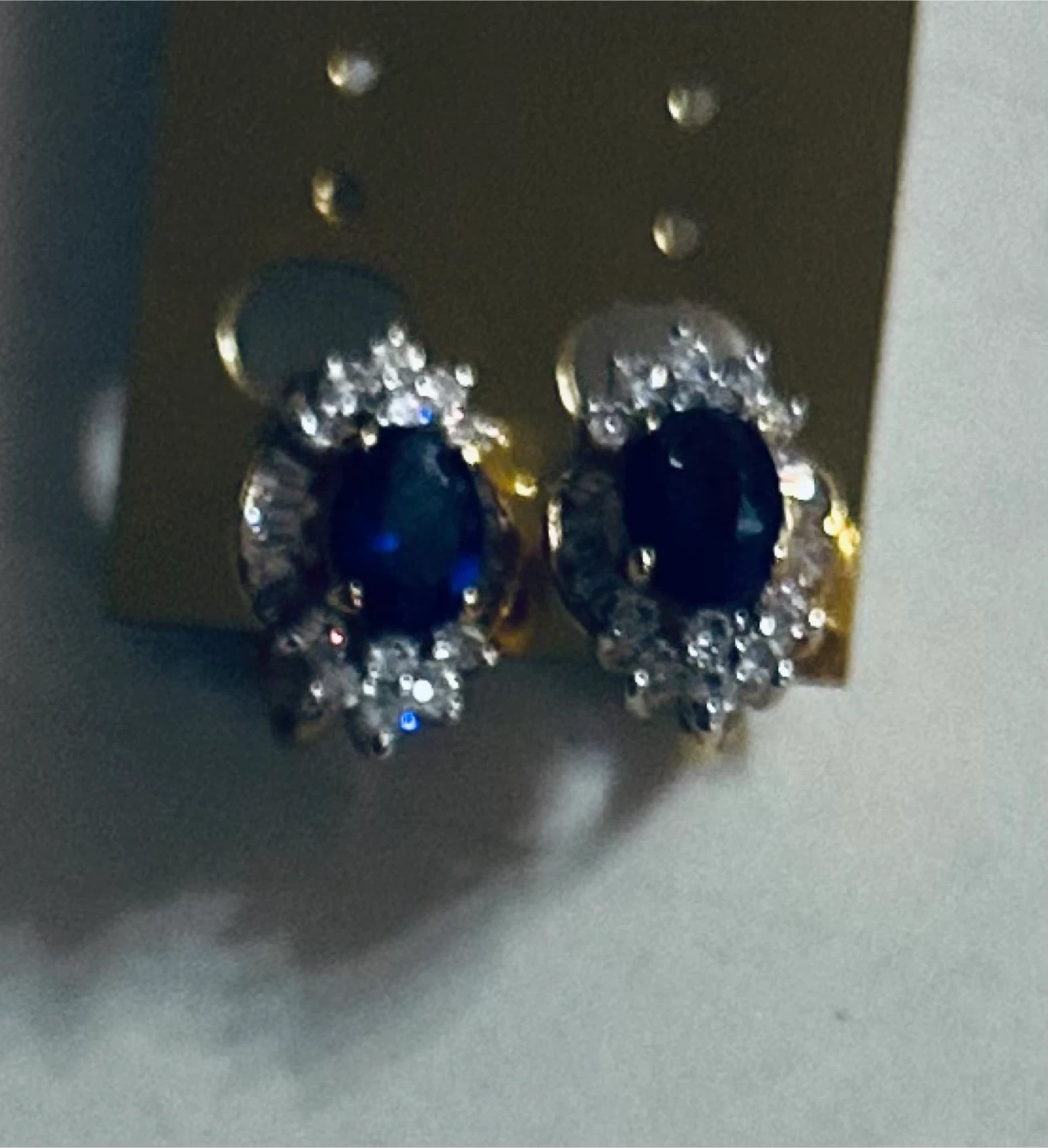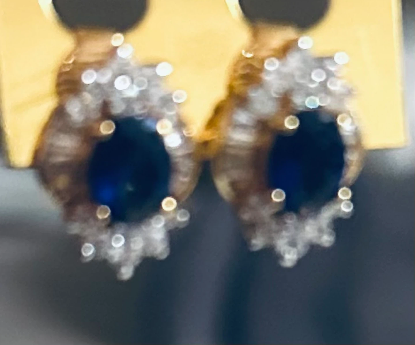 41These are a pair of beautiful earrings. They feature a deep blue sapphire surrounded by sparkling diamonds. They're in great condition and ready to add a touch of elegance to any outfit. Not diamonds it’s zirconia & it’s without pearling you can wear it without pearcing