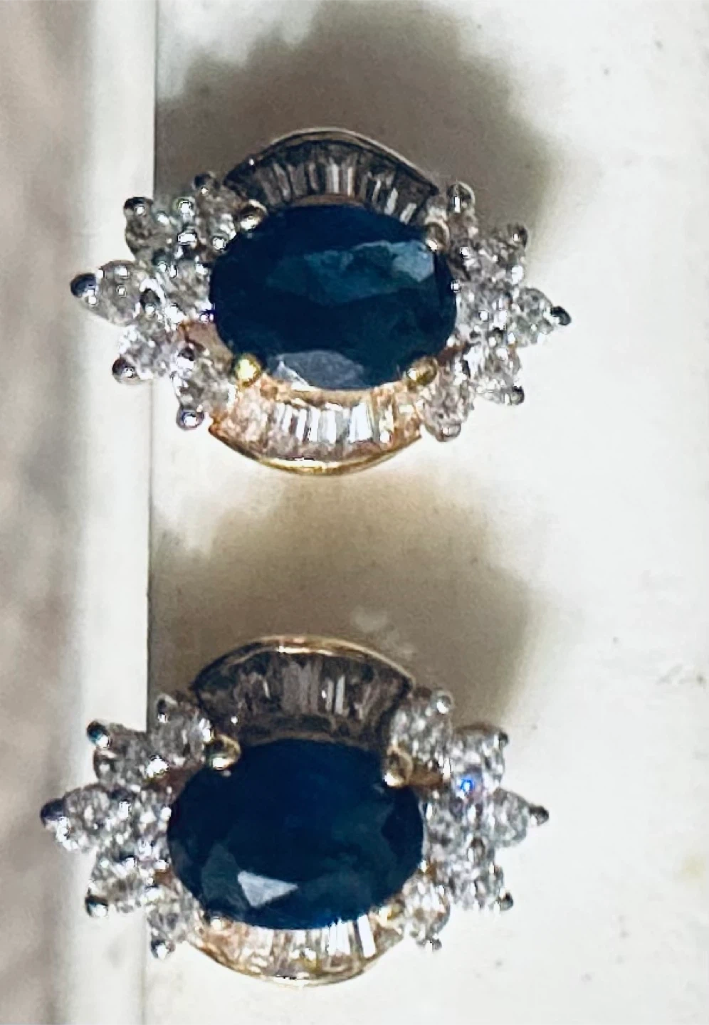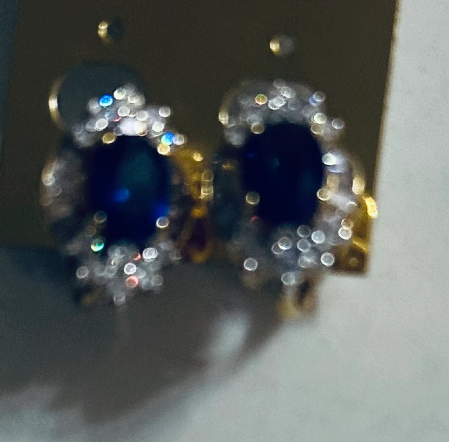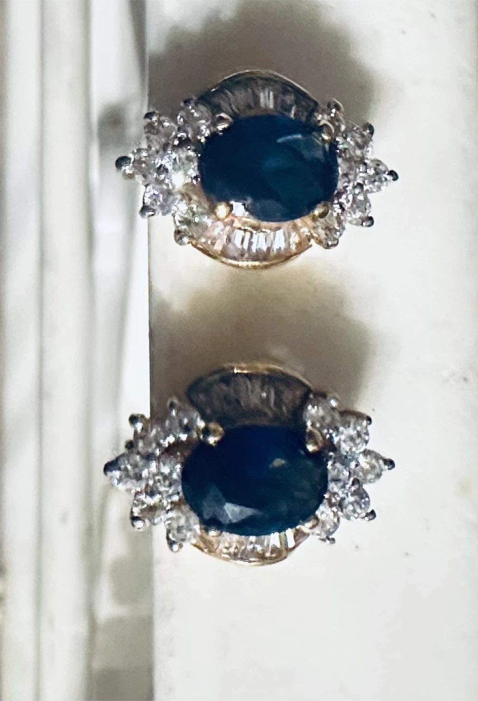 41These are a pair of beautiful earrings. They feature a deep blue sapphire surrounded by sparkling diamonds. They're in great condition and ready to add a touch of elegance to any outfit. Not diamonds it’s zirconia & it’s without pearling you can wear it without pearcing