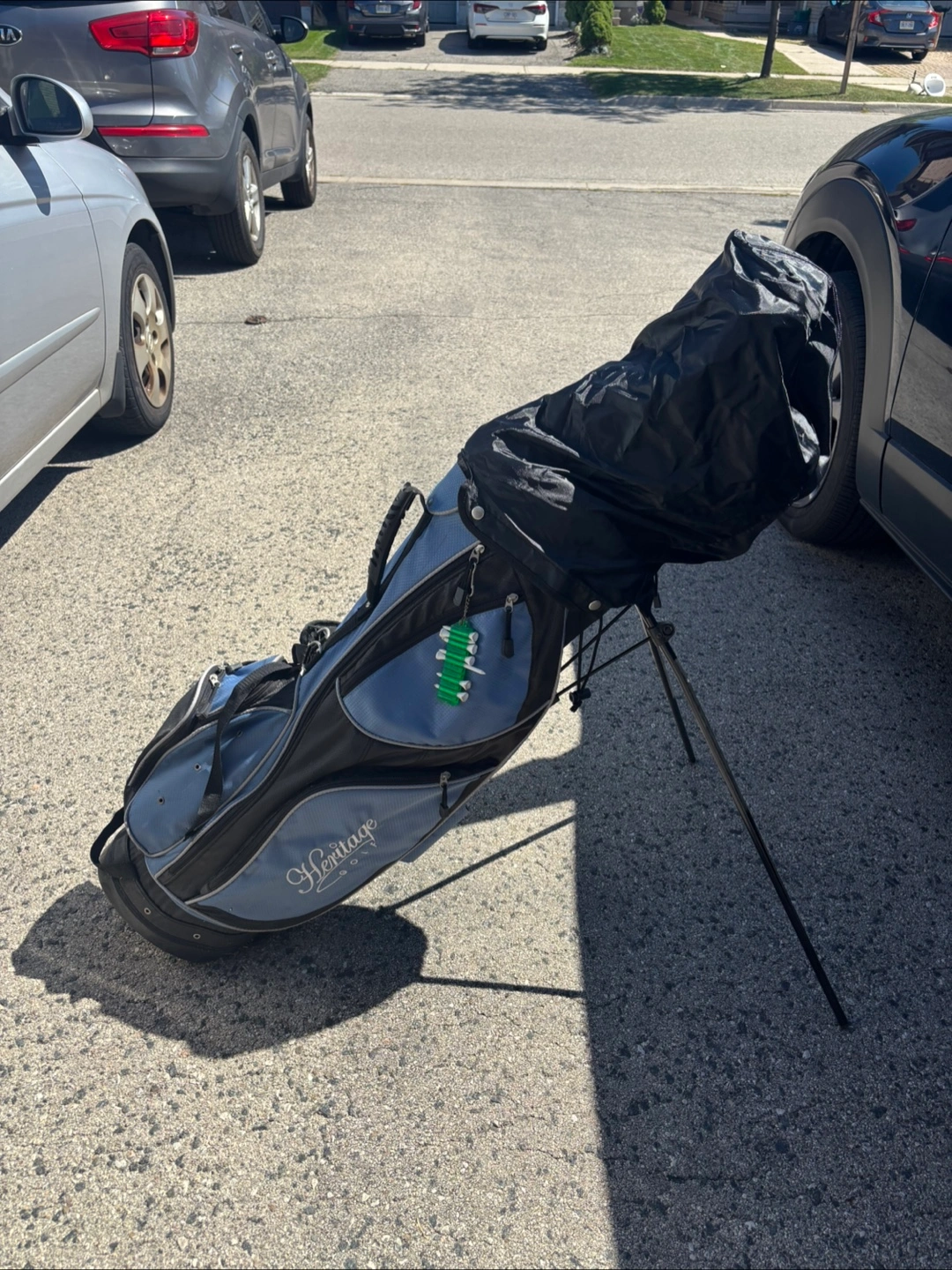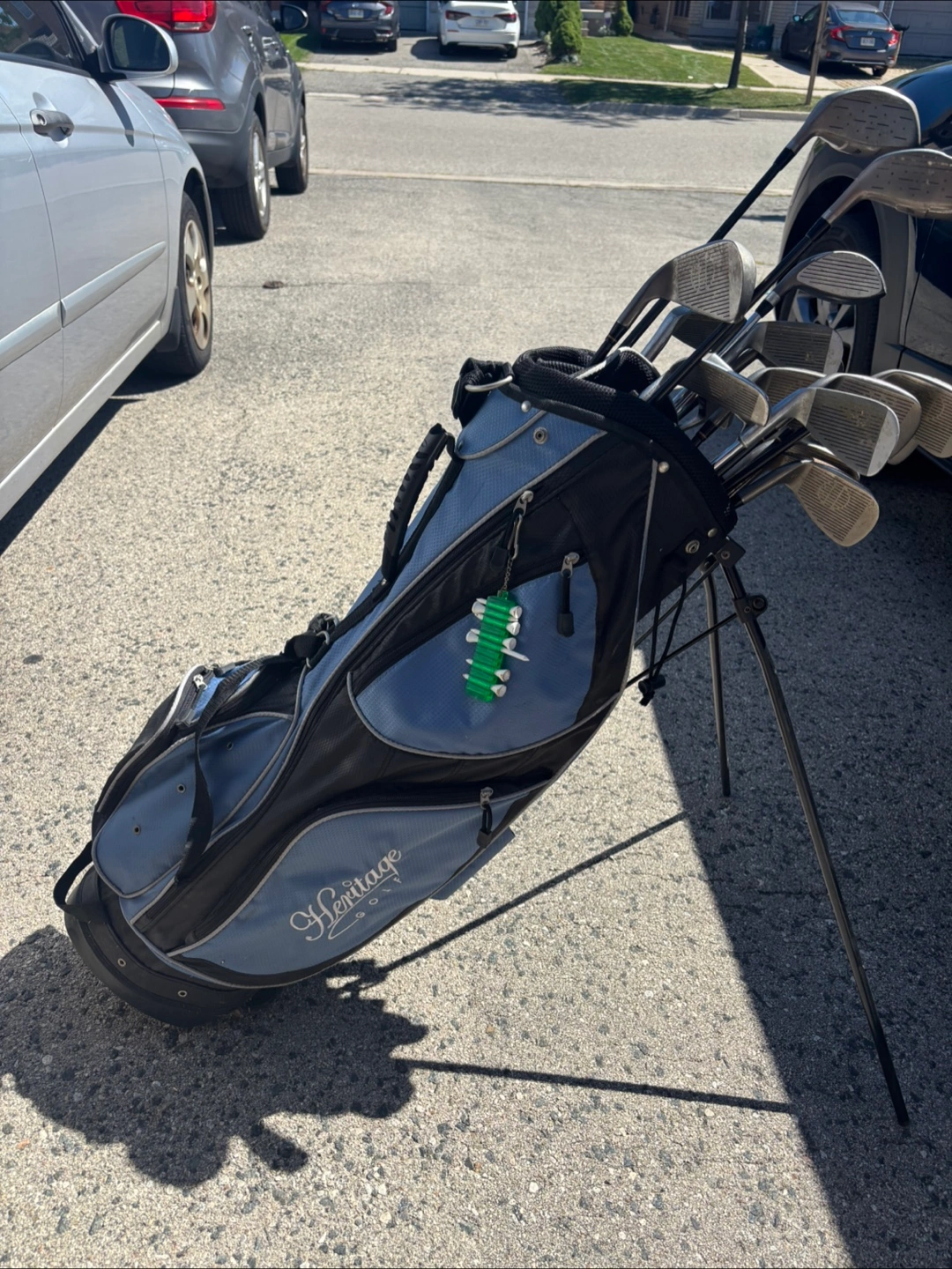 Selling a Heritage golf bag that comes with a set of golf clubs. The clubs include TaylorMade and Knight brands. The bag is in good condition and ready for the course! Clubs and bag are a package…firm.