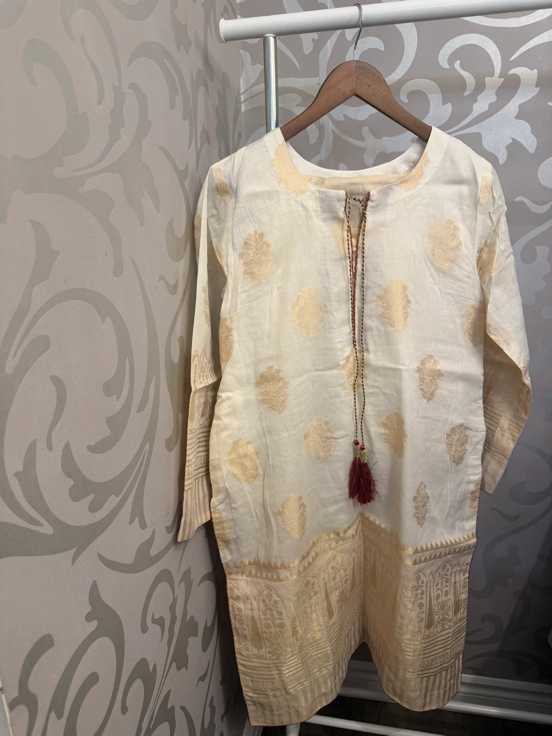 Cream coloured kurti with gold woven pattern all over. It features a contrasting gold patterned border at the hem and cuffs. A sheer yellow dupatta with red and gold trim is included. This outfit is lovely for festive occasions!