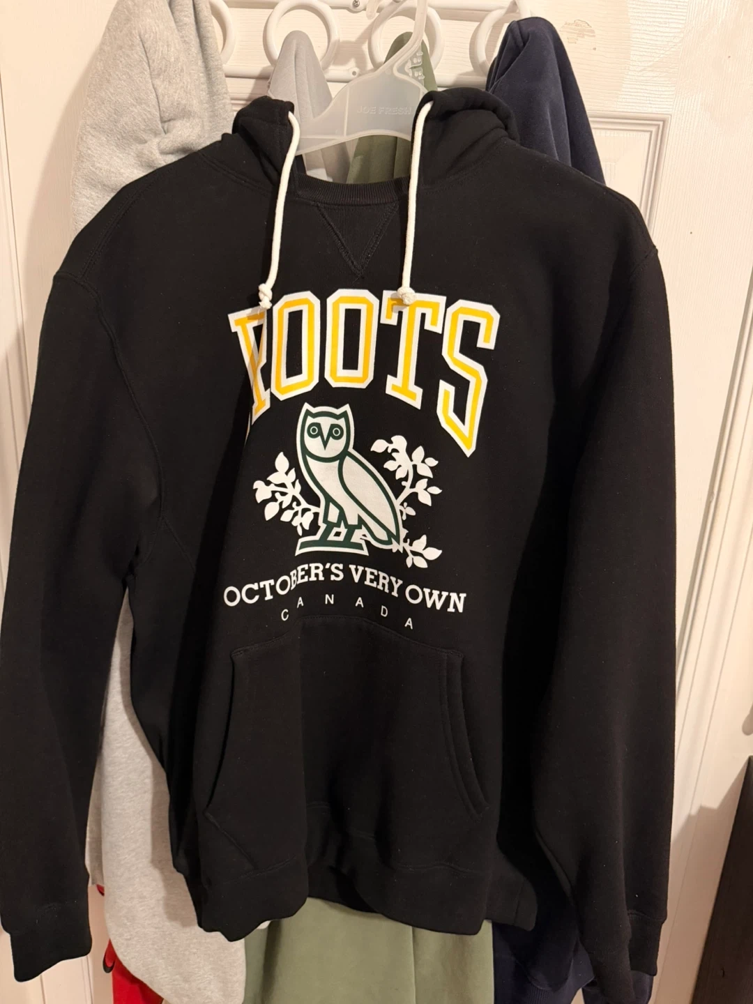 Black pullover hoodie from October's Very Own featuring the classic Roots Canada owl logo. It's a cozy staple for any wardrobe. Cotton blend material.