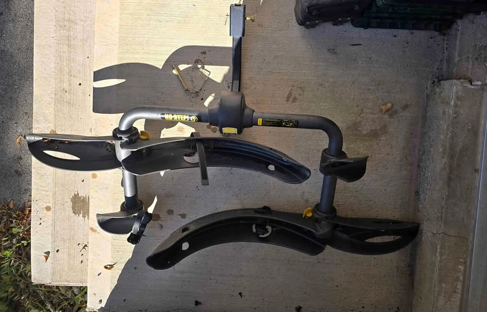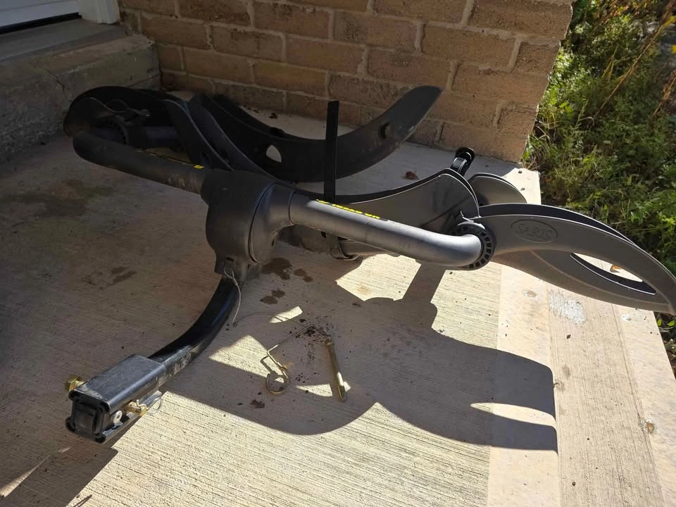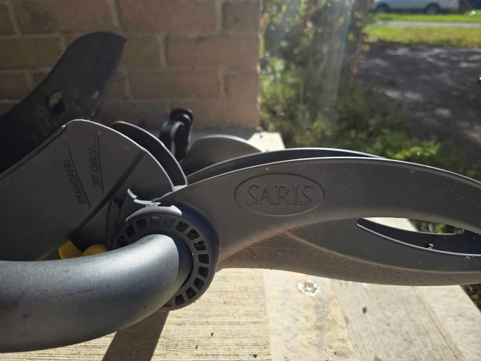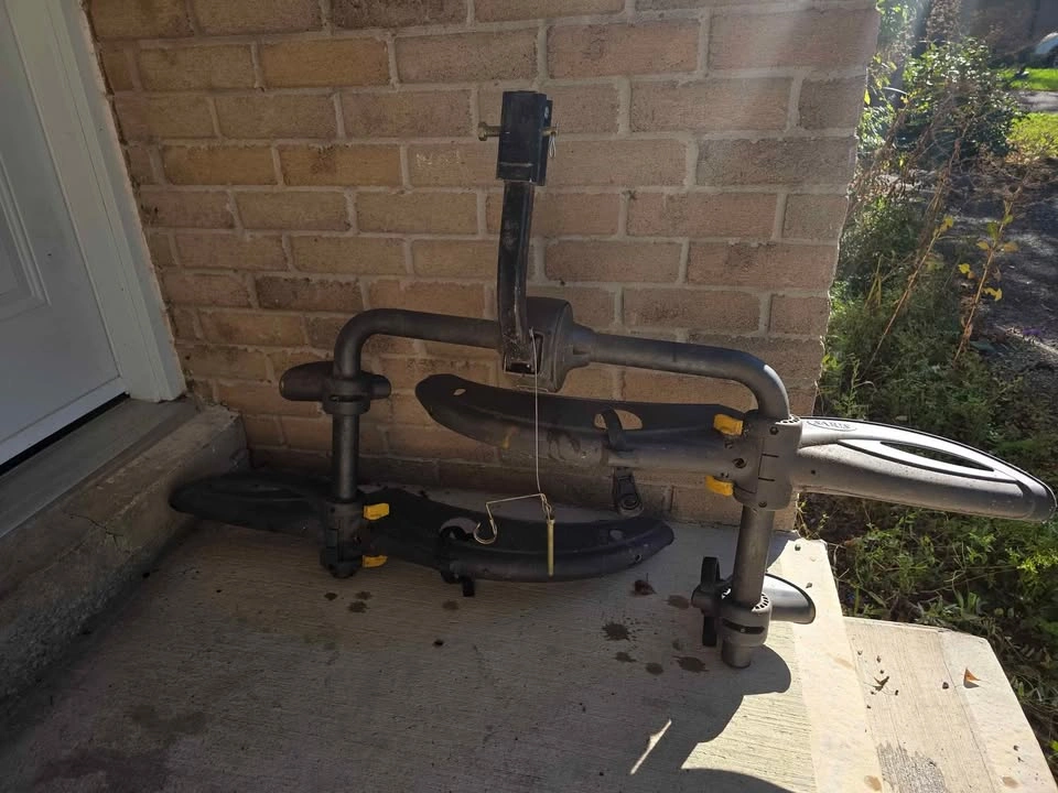 46Saris 2-Bike Car Rack. In Great condition as only used once (A bit dirty from sitting outside for a couple days) Originally bought for $500, Asking $200 OBO! - Fits two 35lb bikes with 700c road tires and 26" or 29" mountain bike tires - Rack folds up when not in use - Trays fold flat to access rear of vehicle - Ratcheting hold-downs and anti-sway ratcheting straps separate and protect from contact with the bike frame - Universal Hitch fits 1 ¼" or 2" hitches