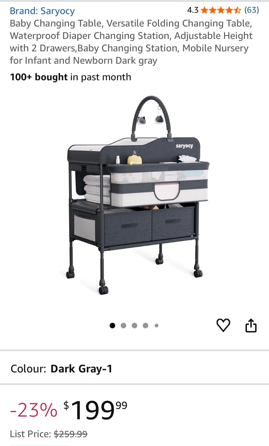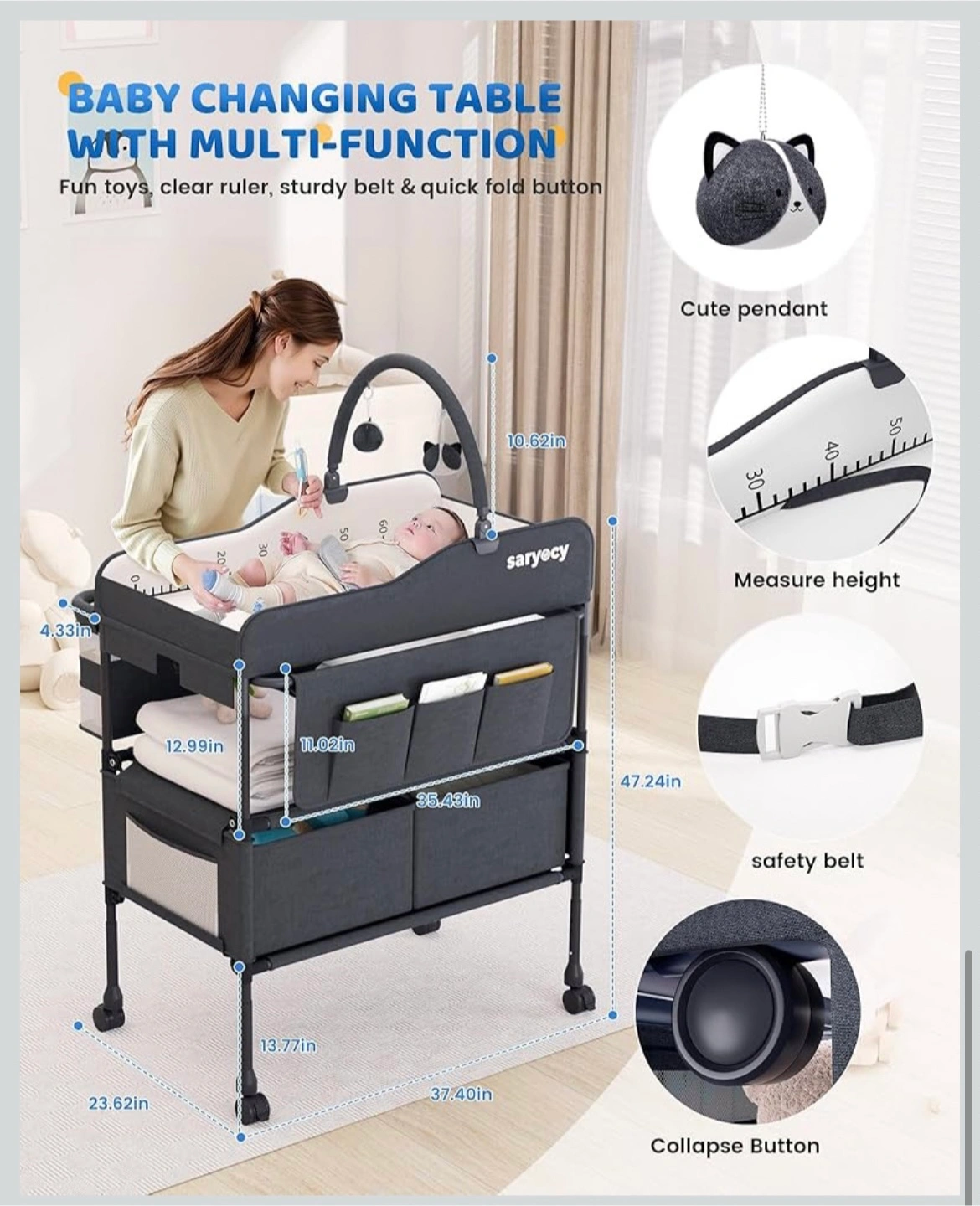 15This Saryeocy baby changing table is a versatile and convenient addition to your nursery! It features a waterproof diaper changing station with adjustable height, making diaper changes easier on your back. Key features include: - Adjustable height with 4 gears - Mobile nursery with wheels - Storage basket, bag and compartment - Safety belt and cute pendant Originally listed for $199.99 PS:This is the final sale. (No exchanges or returns)100% brand new product. Excellent price. No bargaining accepted. First come, first served.