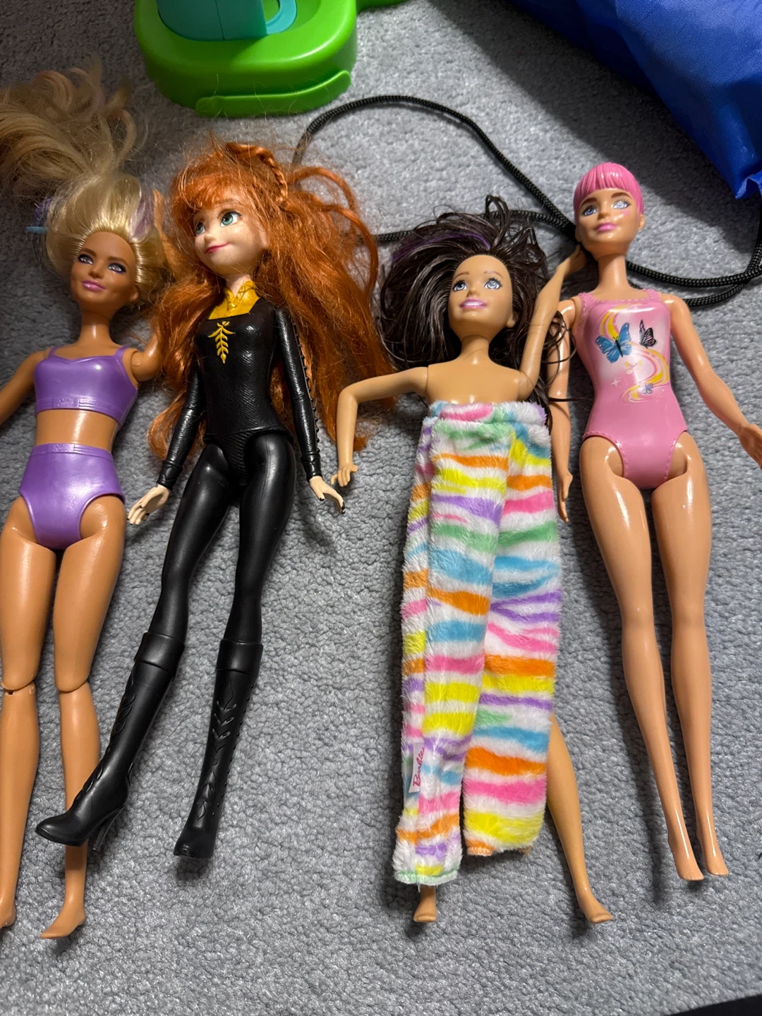 This bundle includes four dolls, featuring popular characters and styles. One doll is dressed in a black outfit with boots, another in a purple swimsuit, and a third in a pink swimsuit with a butterfly design. The fourth doll wears a colourful striped towel. These dolls are ready for playtime!