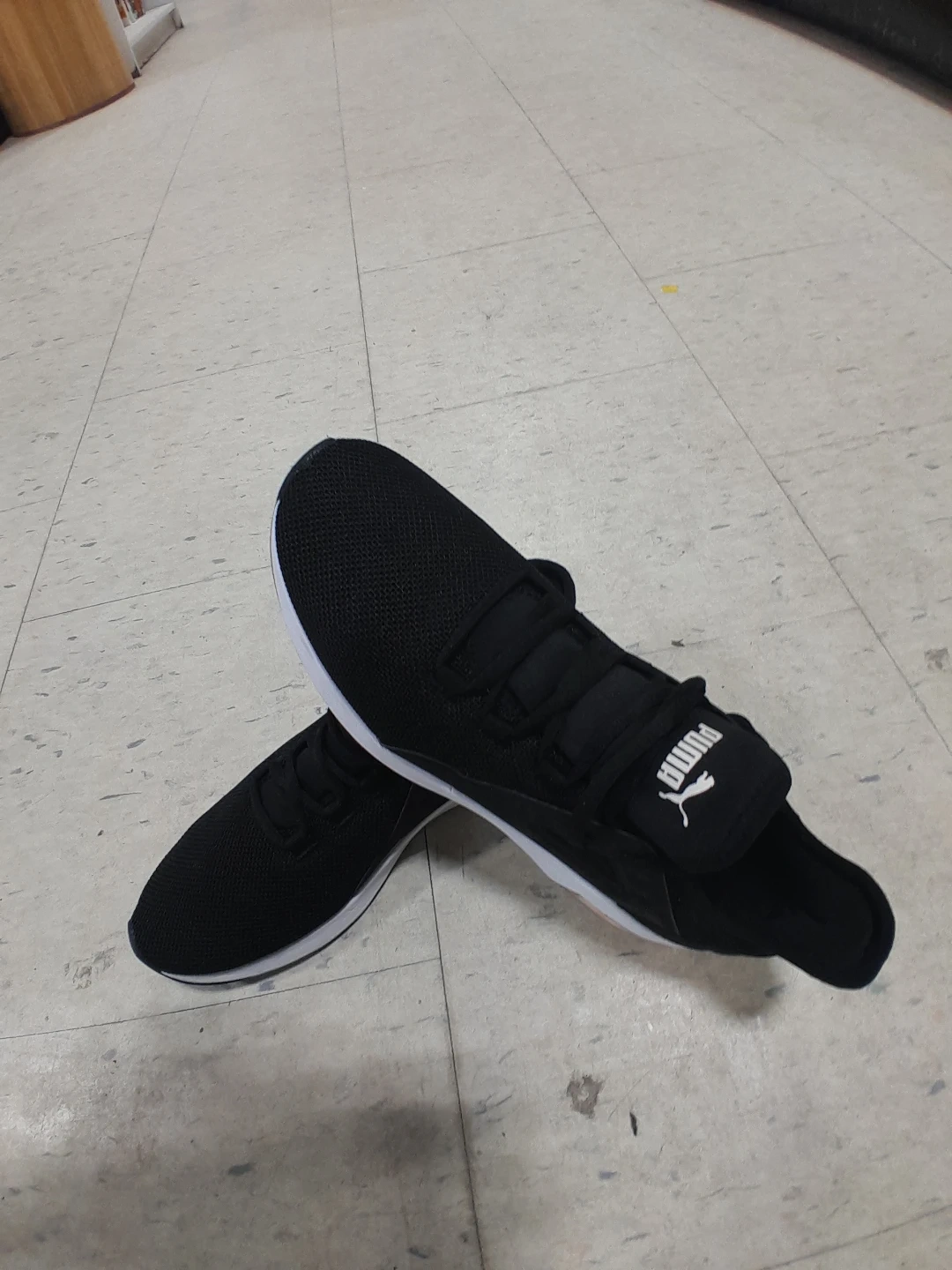 These are black Puma running shoes. They feature a breathable mesh upper and a cushioned sole. These shoes are suitable for everyday wear or light jogging women's size 9.5