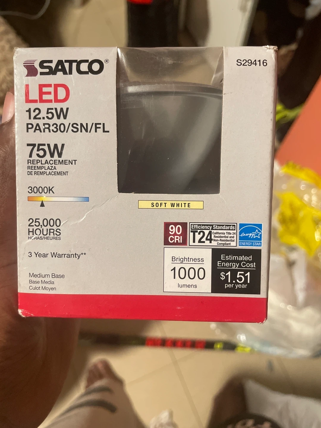 Selling a brand new SATCO LED light bulb. It's a 12.5W PAR30/SN/FL model, equivalent to a 75W replacement. It emits a soft white light at 3000K and has a brightness of 1000 lumens. It has a medium base and is estimated to cost $1.51 per year in energy. It also comes with a 3-year warranty