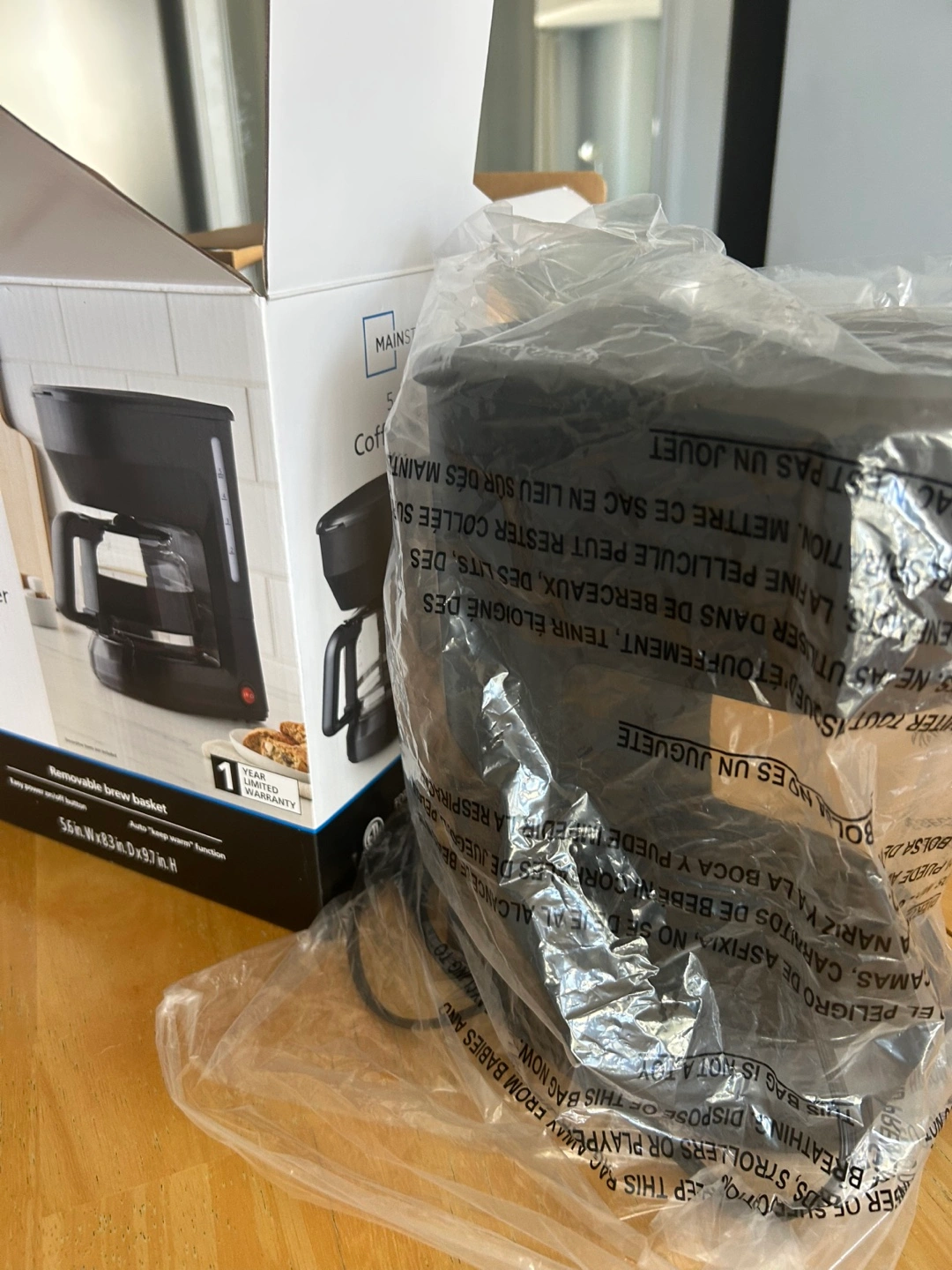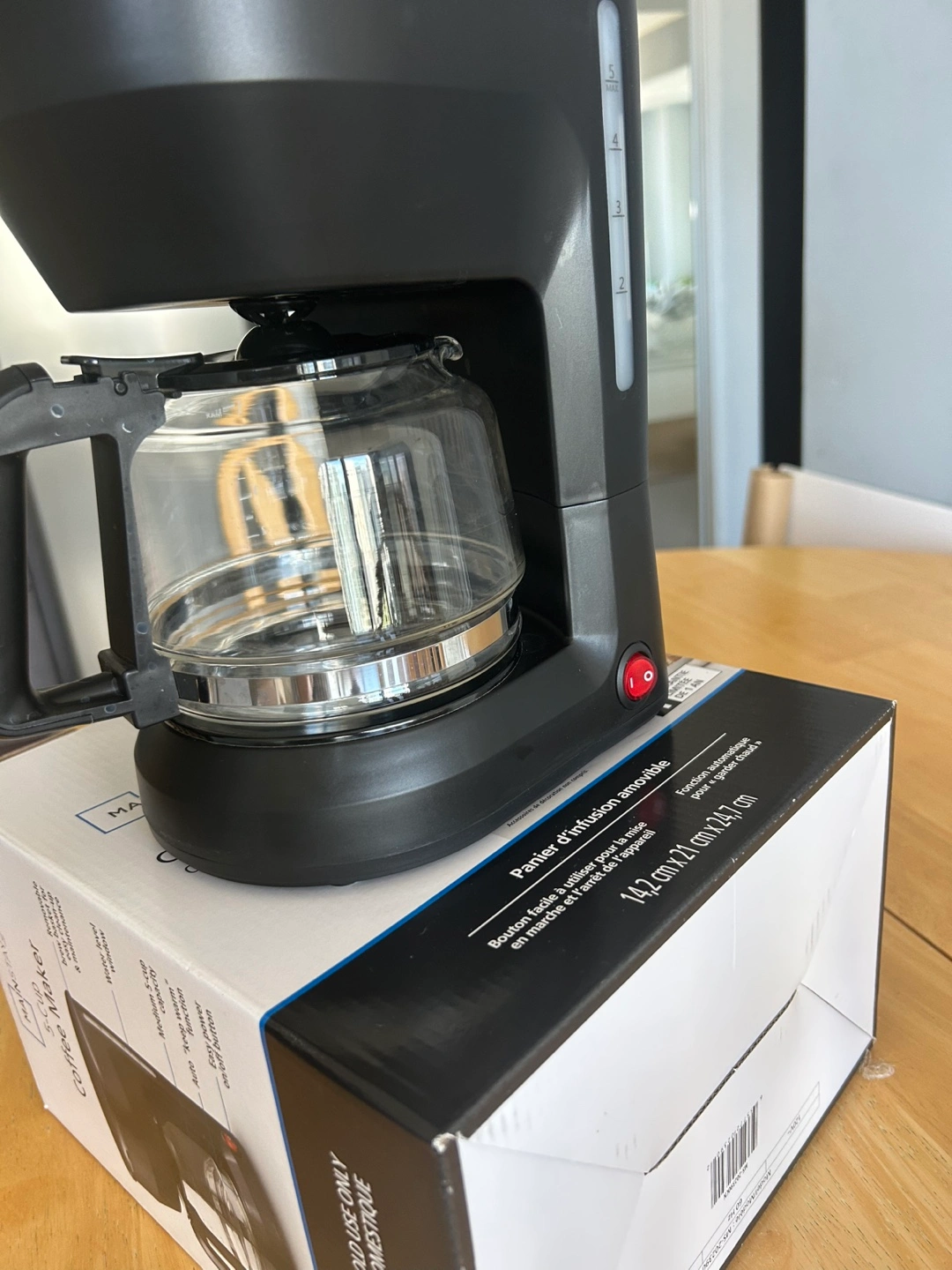 Black coffee maker. Glass carafe with a handle. The coffee maker is sitting on top of its original box. Start your day right with a fresh cup of coffee.