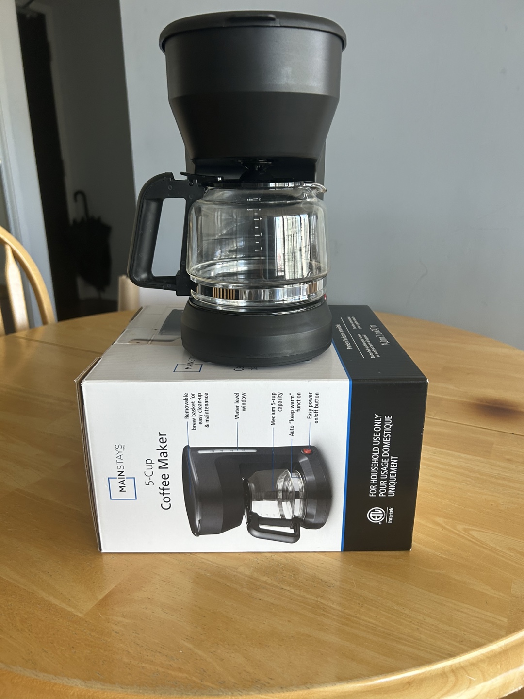 Black coffee maker. Glass carafe with a handle. The coffee maker is sitting on top of its original box. Start your day right with a fresh cup of coffee.