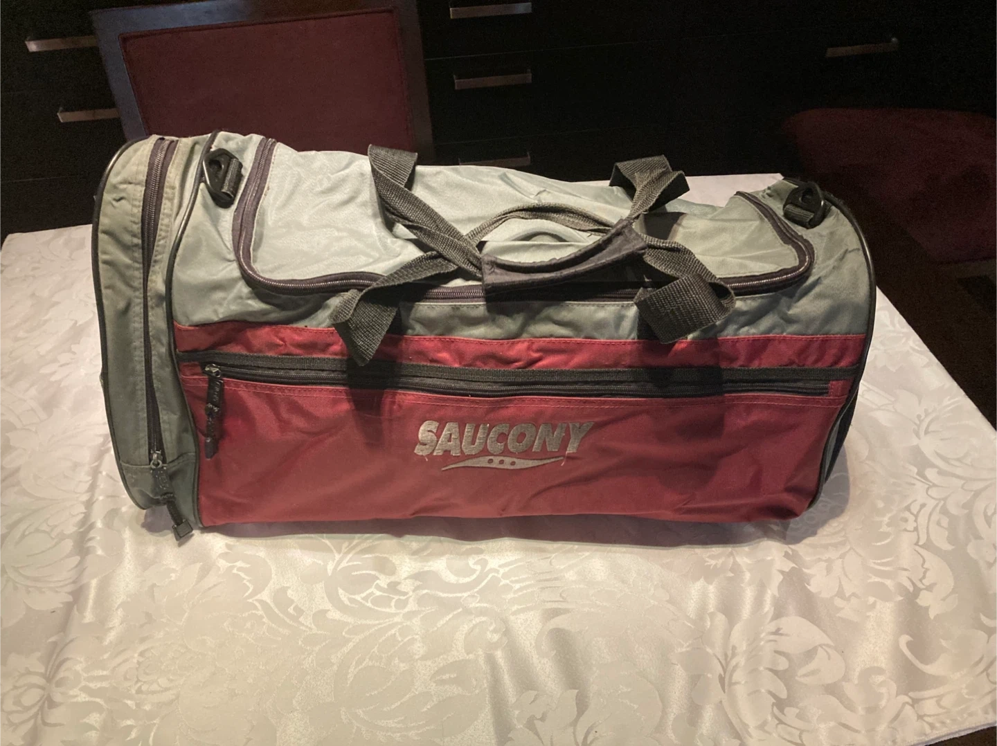 224Here's a Saucony sports bag in grey and maroon! It's in good condition, with separate shoe storage compartment, many zippered pockets and a shoulder strap. Great for the gym or travel.