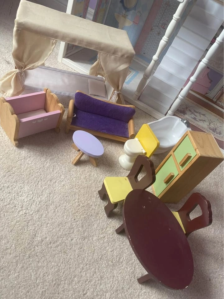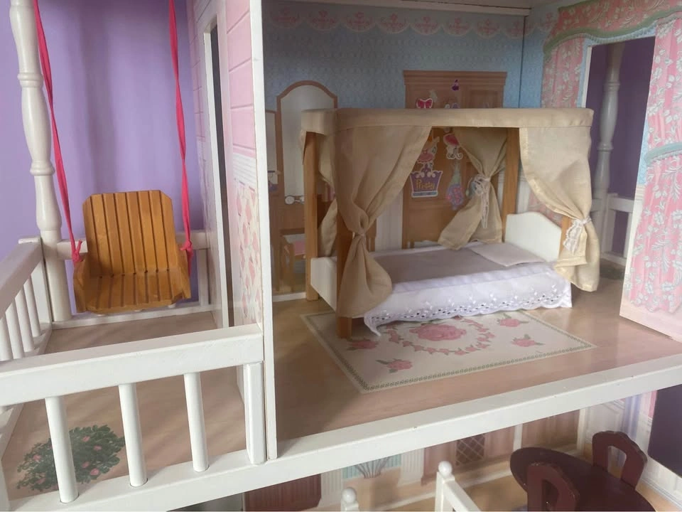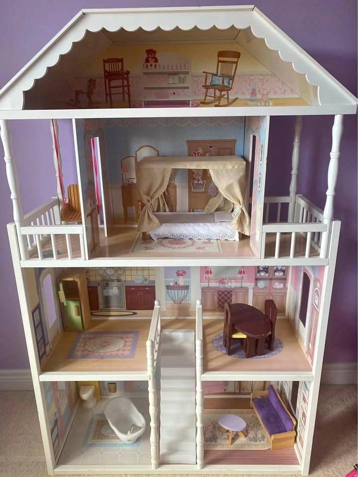 10Features of the KidKraft Savannah Dollhouse: It is designed to resemble a classic southern mansion. The dollhouse stands over four feet tall and features four levels with six rooms and two balconies. It typically includes a 10-piece accessory pack with handcrafted, hand-painted wood furniture. Notable features include a working porch swing and opening refrigerator. This dollhouse is designed for 12-inch fashion dolls, such as Barbie dolls.