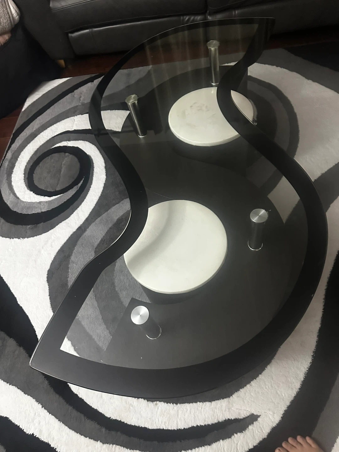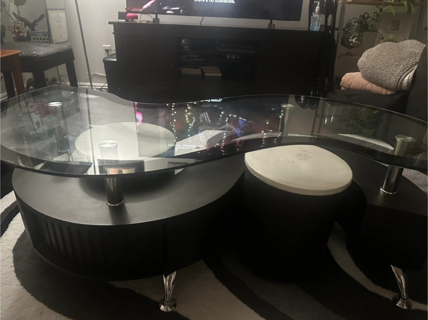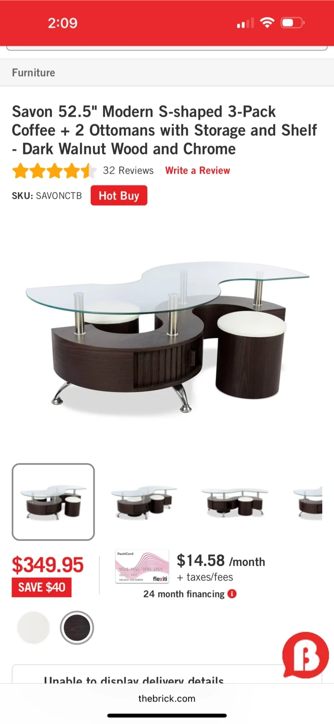 60Selling a Savon 52.5" Modern S-shaped 3-Pack Coffee Table with 2 Ottomans. It features storage and a shelf, with dark walnut wood and chrome accents. Originally bought for $349.95.