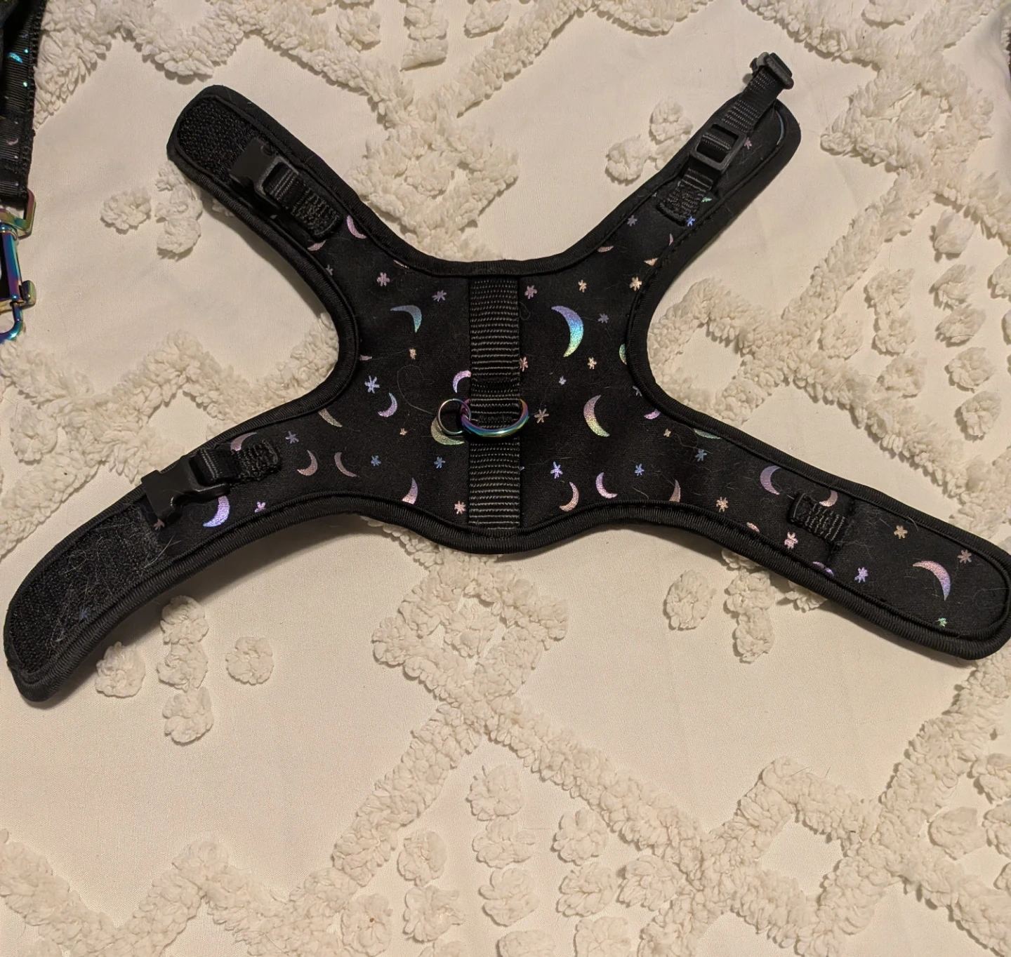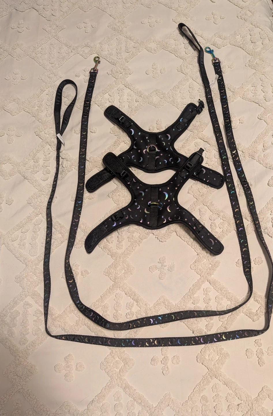 This cat harness and leash set features a fun crescent moon and star pattern on black fabric. It includes two harnesses and one leash. Adjustable straps ensure a comfy fit for your canine pal!