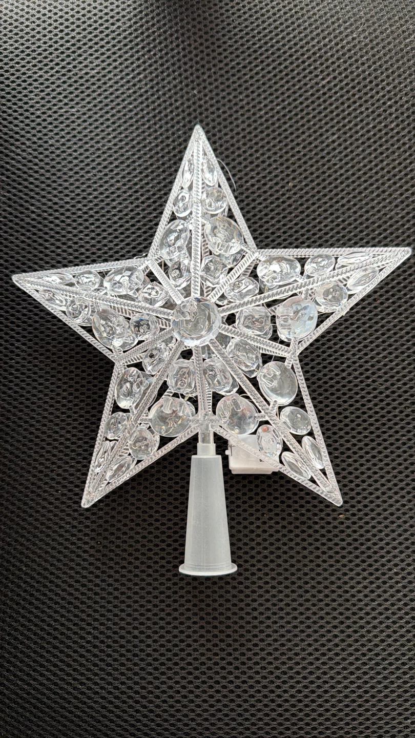 This sparkly star tree topper is covered in clear gems for a festive look. It fits easily onto most Christmas trees. Add some shine to your holiday decor!