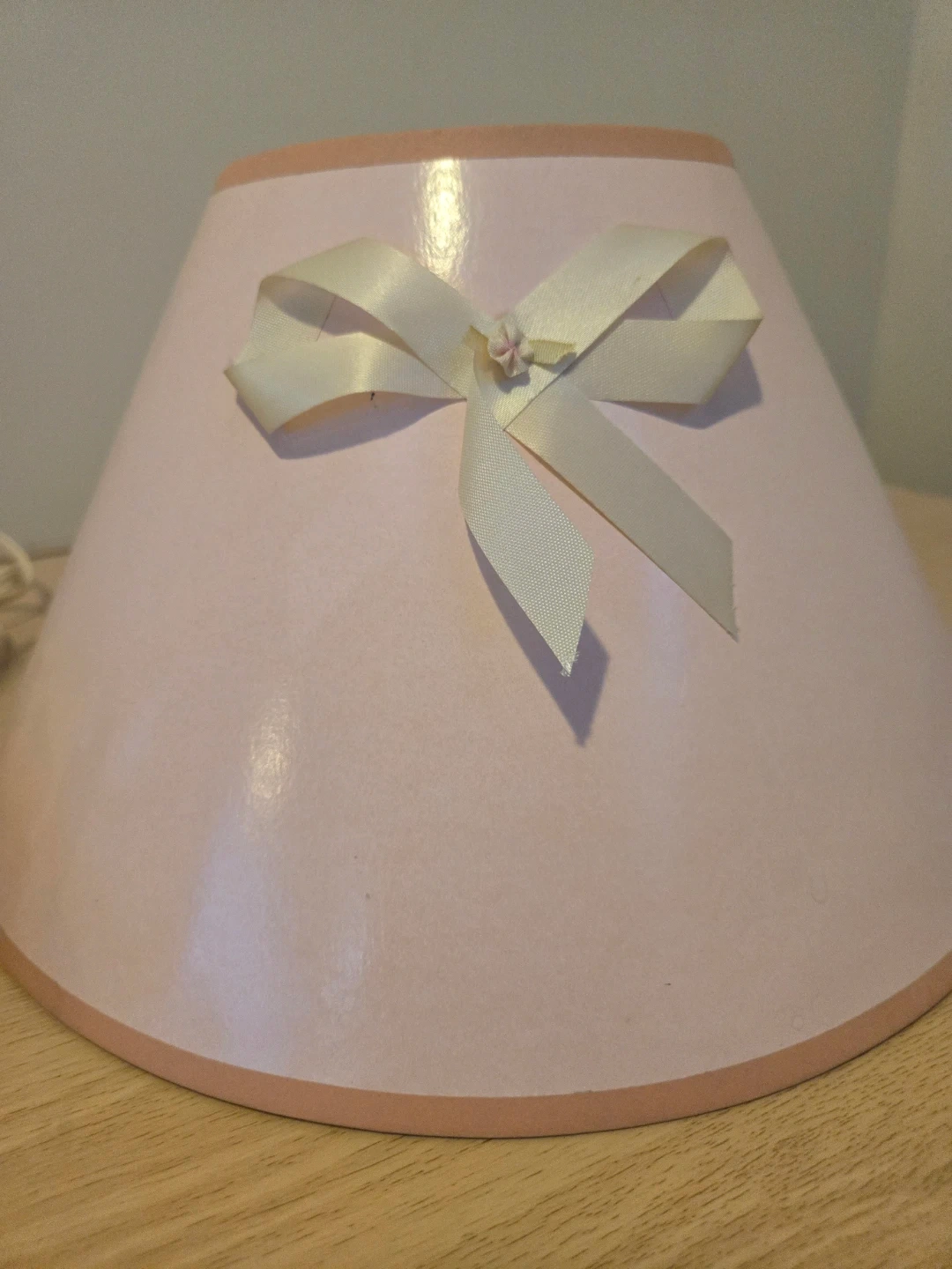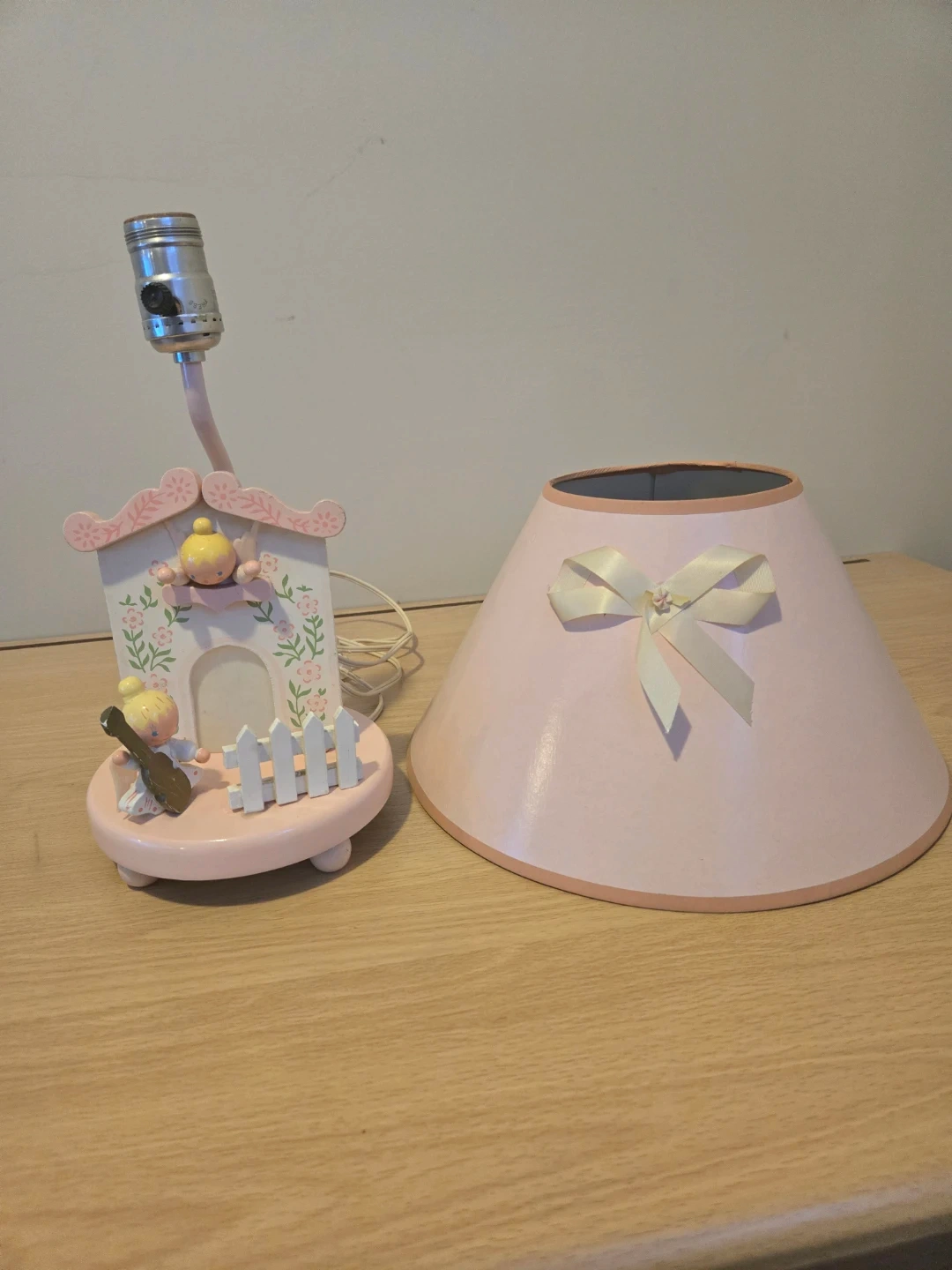 This charming antique Fisher Price lamp features a pink base with two angelic figurines, one playing a guitar. It has a decorative lampshade adorned with a ribbon and a small flower. The lamp's base is decorated with floral motifs.