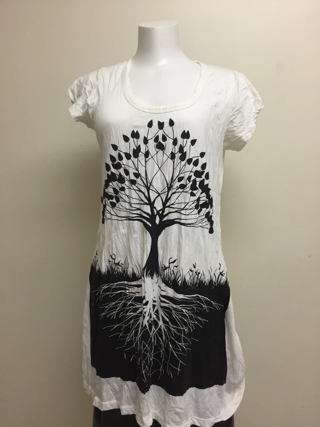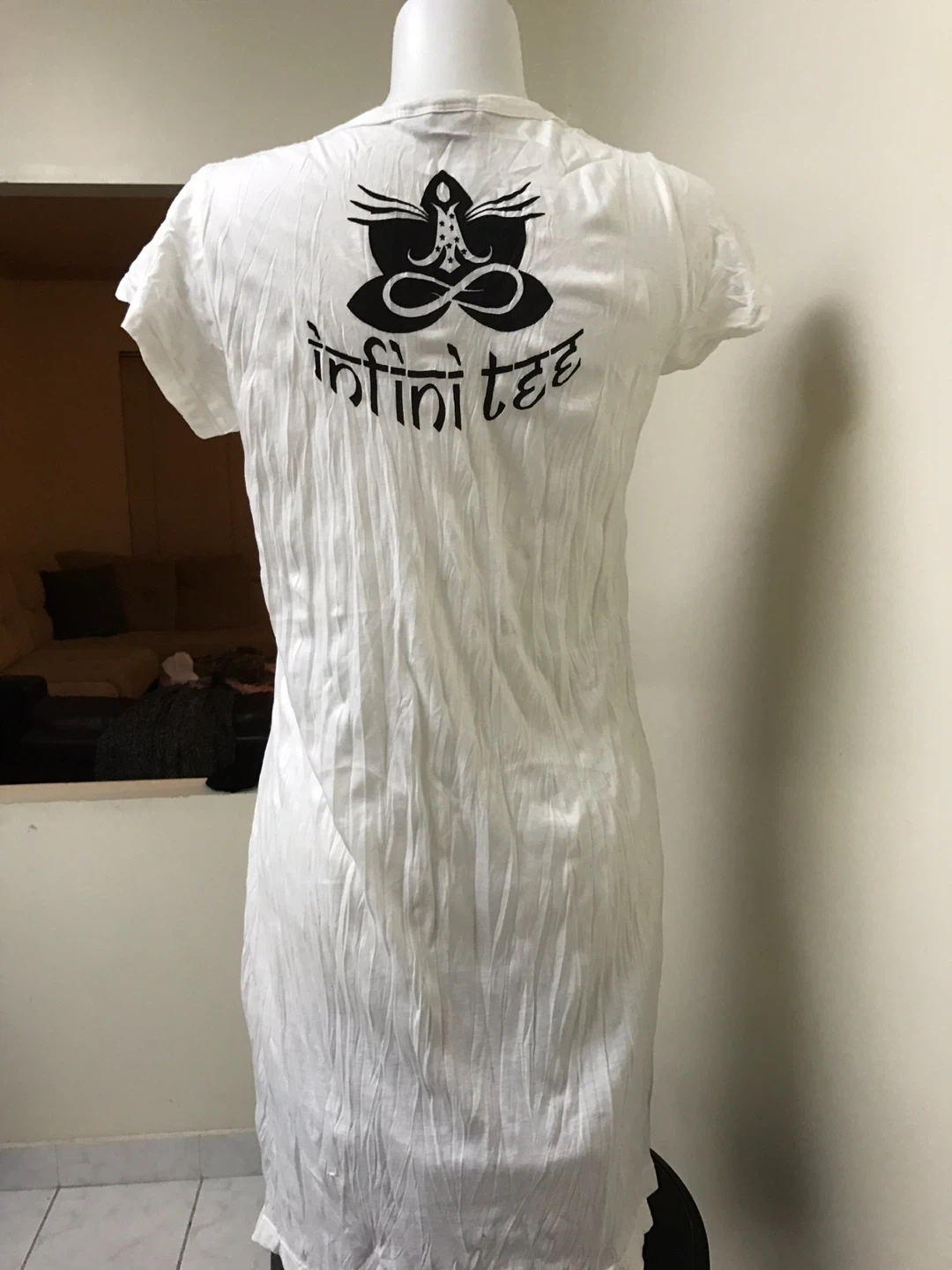 Unique White t-shirt featuring a striking black Tree of Life graphic on the front and 'Infinitee' text with a meditative figure on the back. It's made of a soft, textured fabric. This shirt's design is unique and eye-catching!
