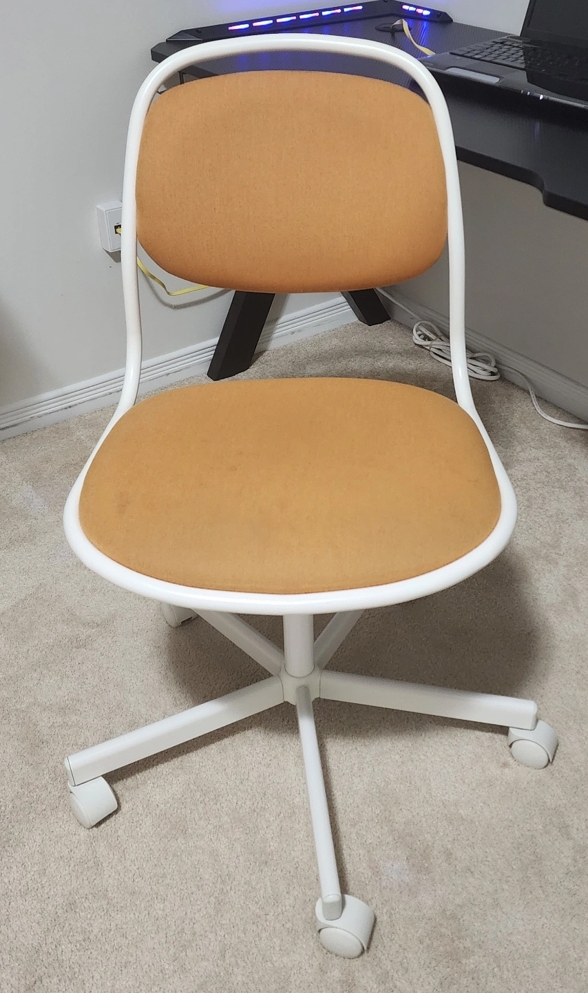 Comfortable swivel chair, mustard yellow fabric. White frame and base. Five caster wheels. Good used condition.