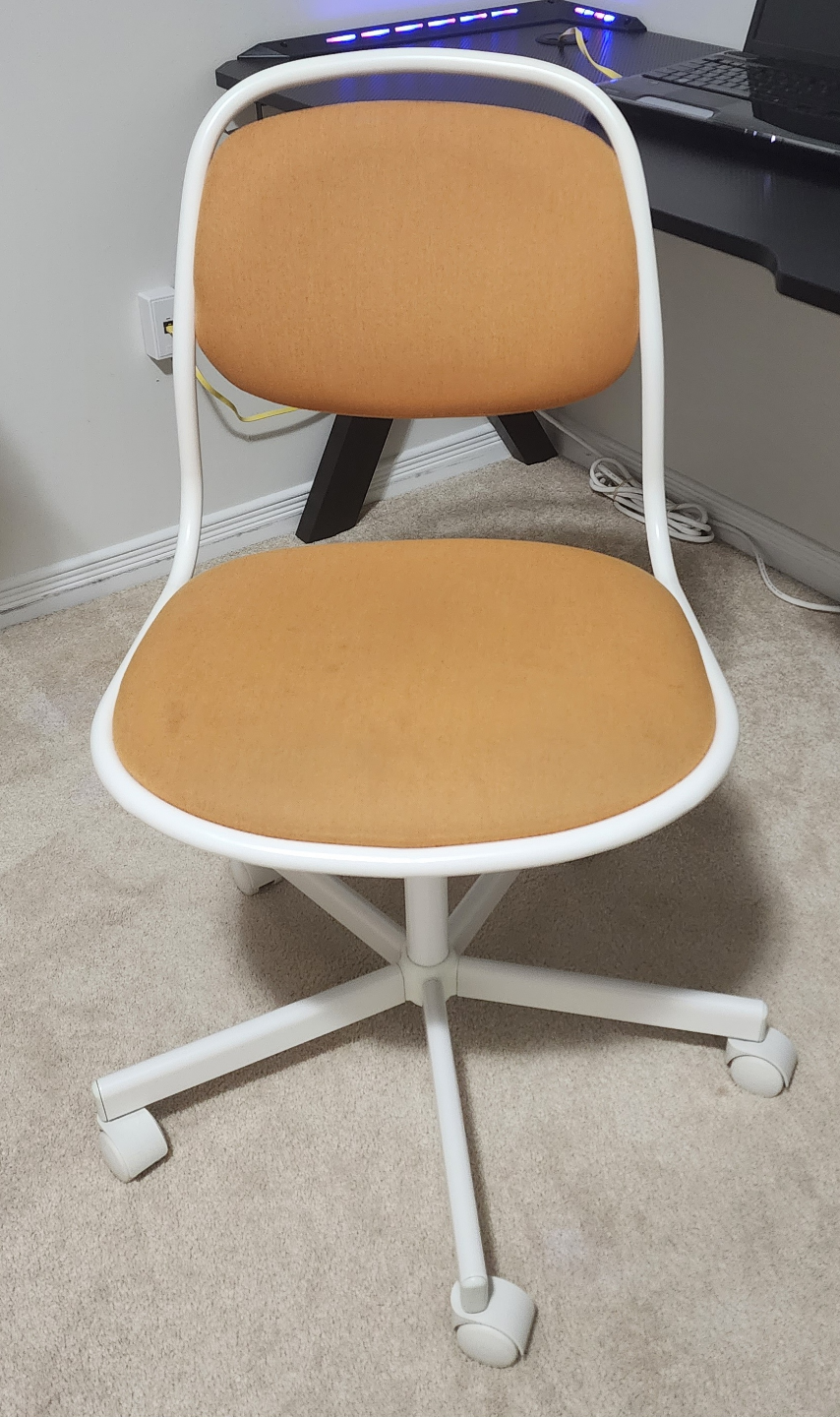 Comfortable swivel chair, mustard yellow fabric. White frame and base. Five caster wheels. Good used condition.