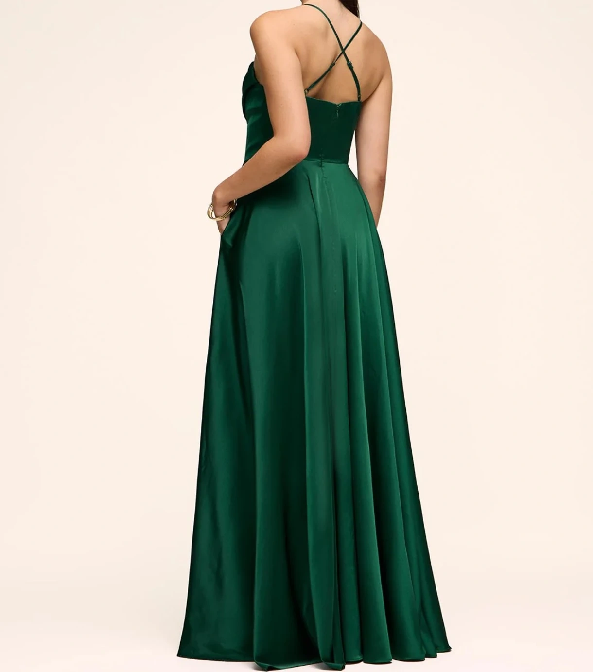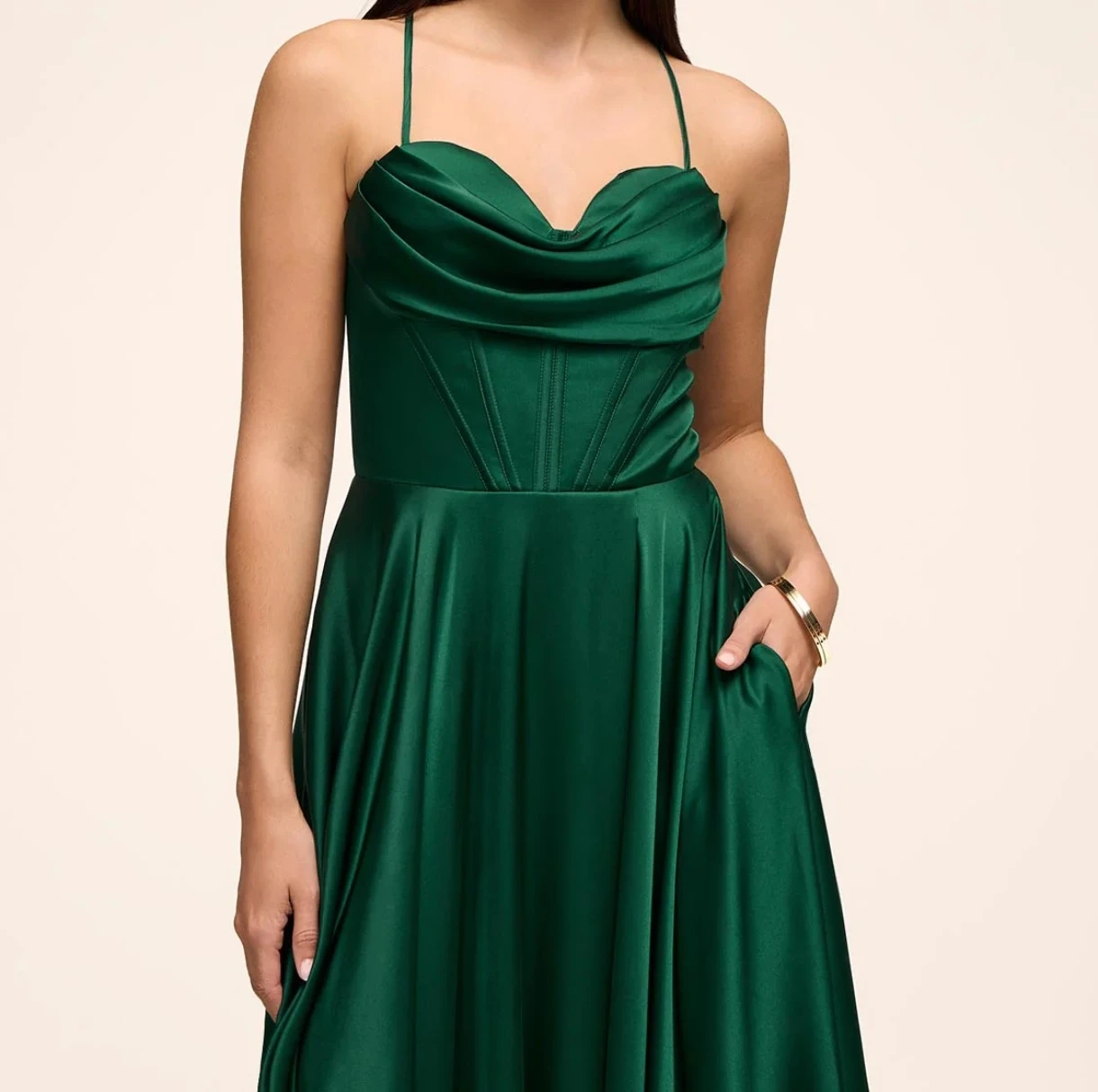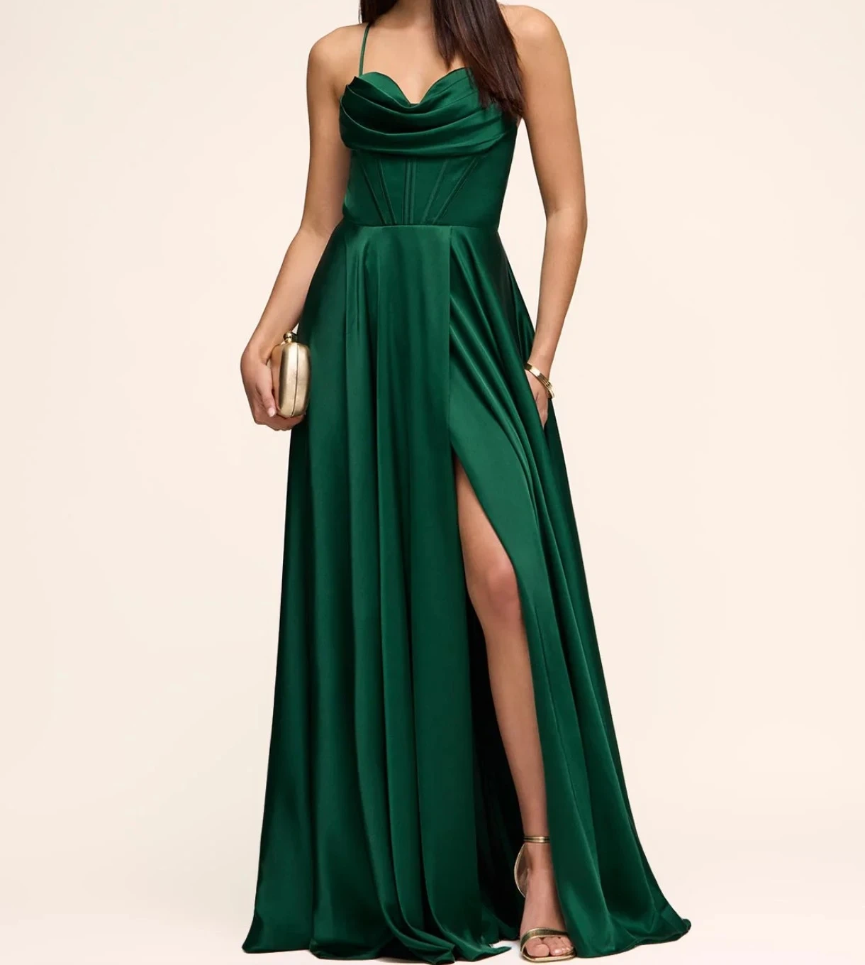 Beautiful emerald green satin dress with a corset bodice and sweetheart neckline. Features adjustable spaghetti straps and a high slit