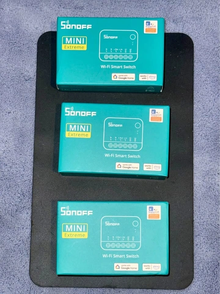 I have three brand new Sonoff Mini Extreme Wi-Fi Smart Switches for sale. They work with both Google Home and Alexa, making your home automation a breeze.
