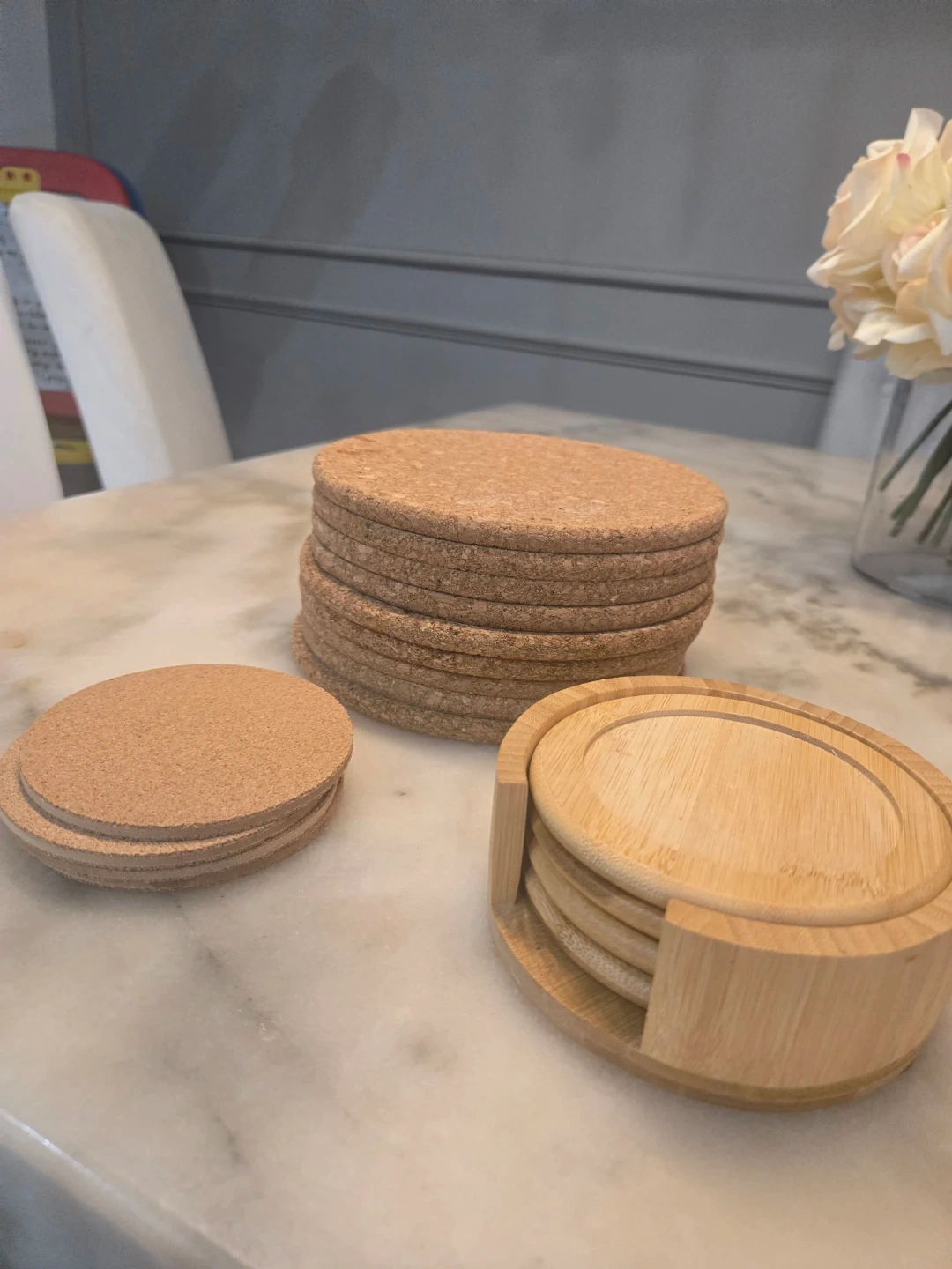 This is a stack of round cork coasters. They're made from natural cork material. Cork coasters protect surfaces from drink rings and heat. Handy for everyday use or entertaining!