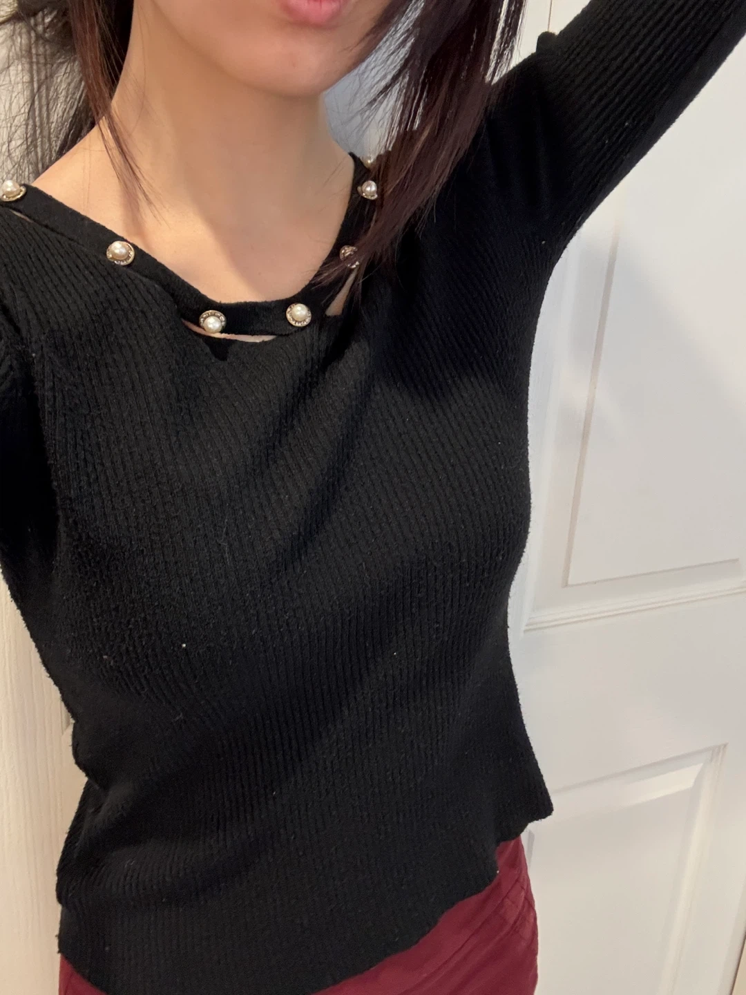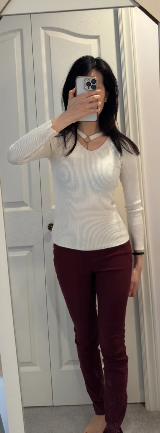 This is a white, long-sleeved, ribbed knit top. It features a V-neck with a decorative metal ring detail. The material is stretchy and comfortable. Perfect for casual wear!