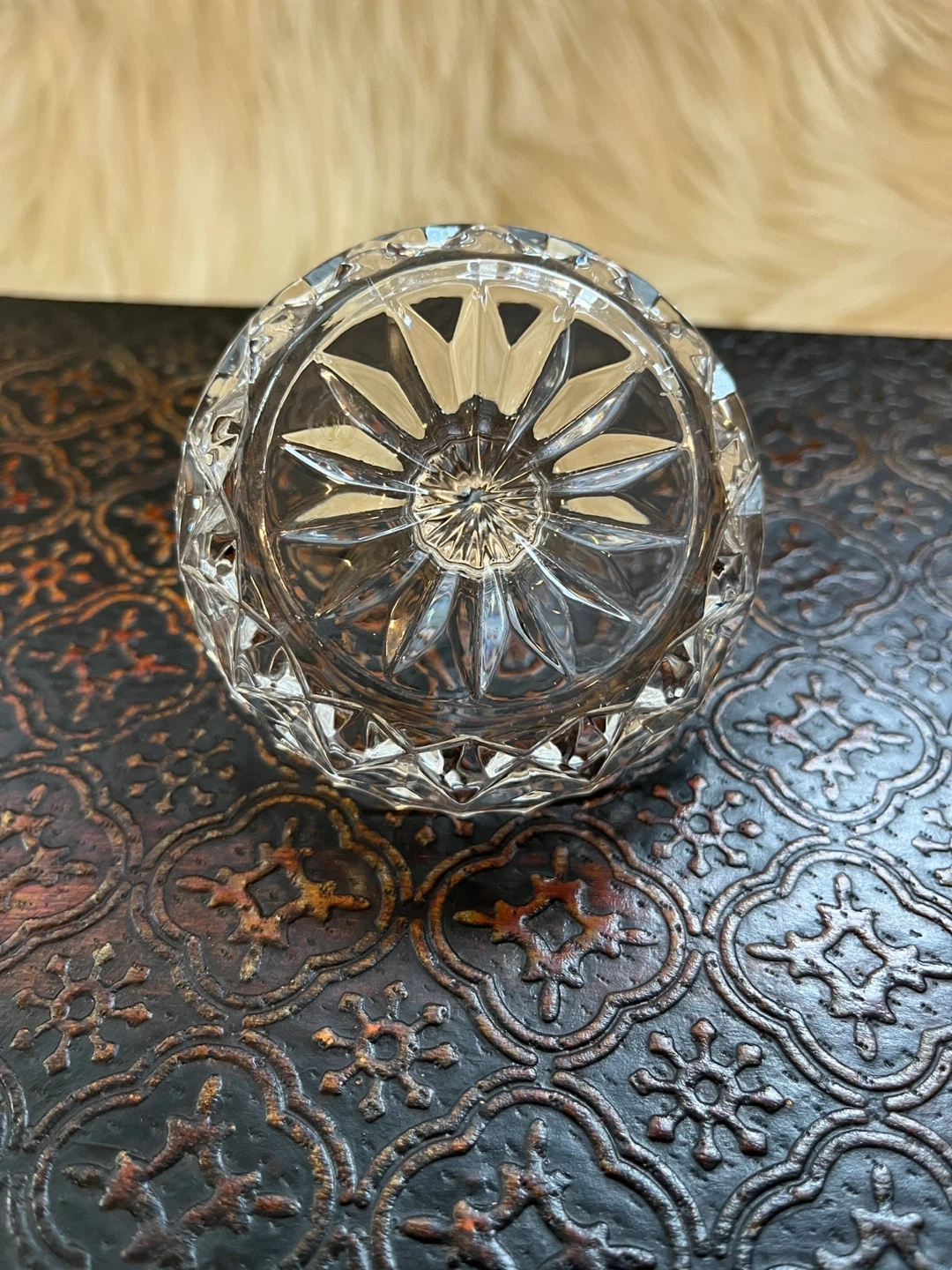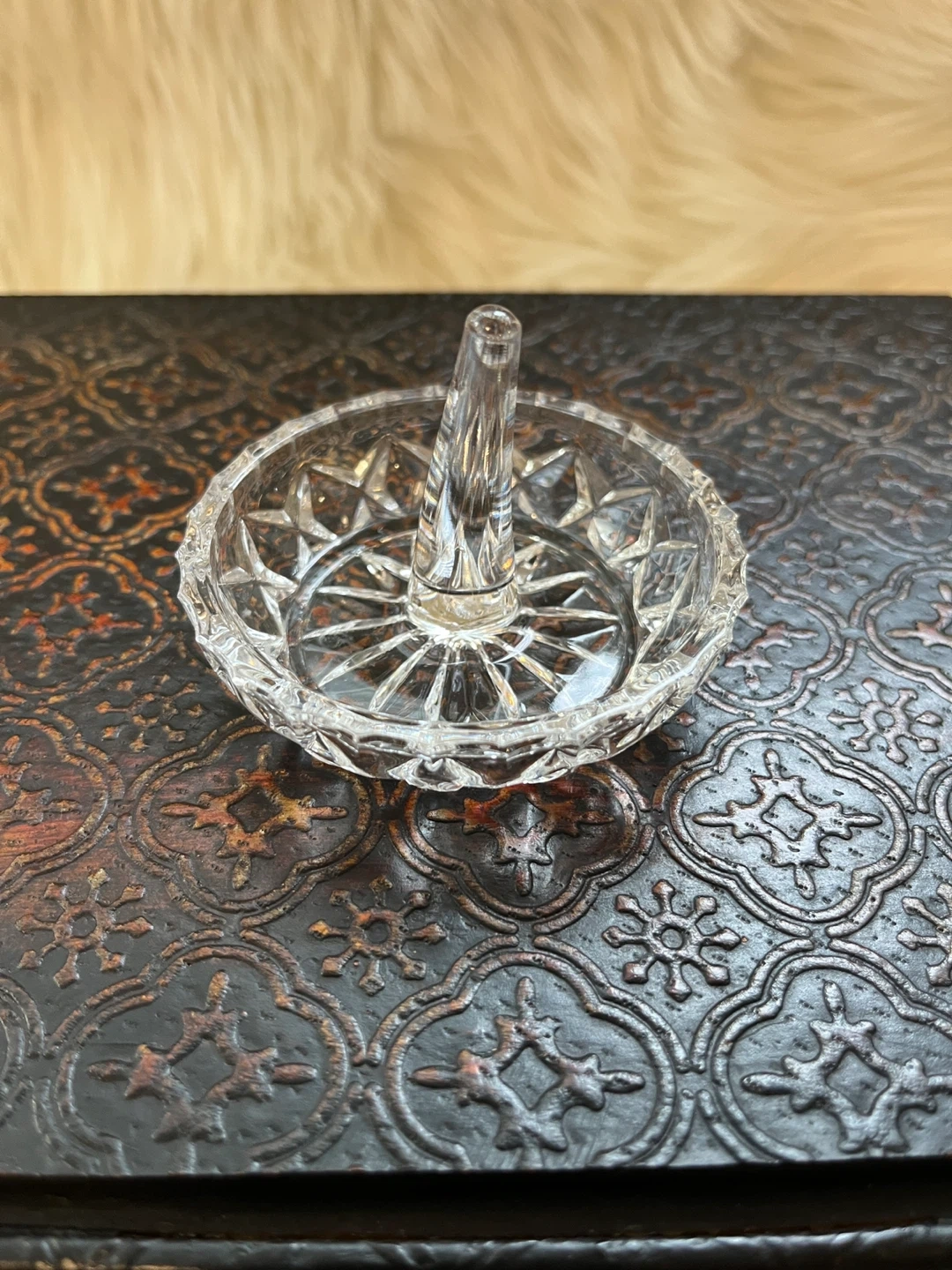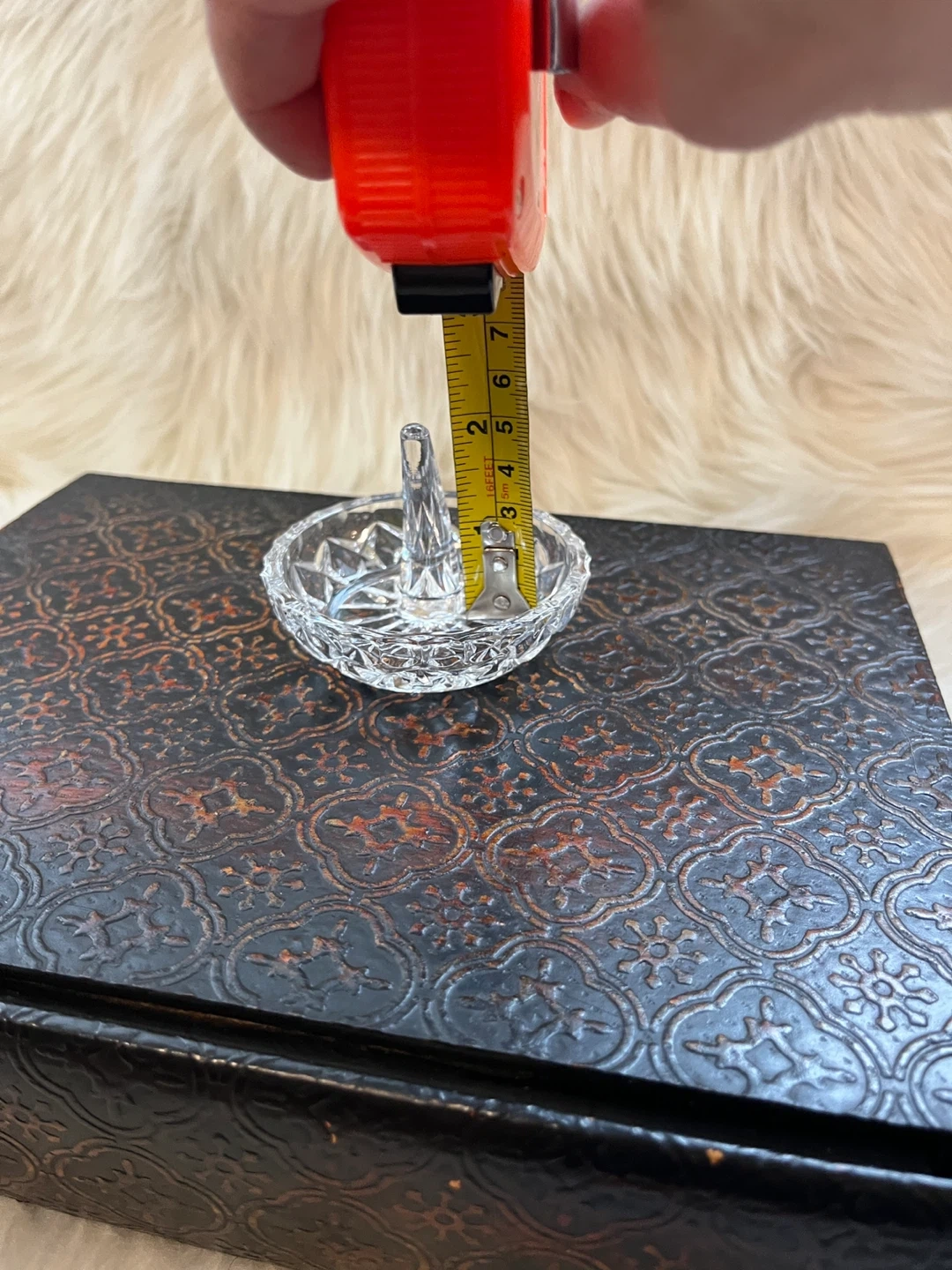 Selling a lovely crystal ring holder dish! It measures approximately 3.25 inches in diameter and stands about 2.5 inches tall. Perfect for keeping your rings safe and organized