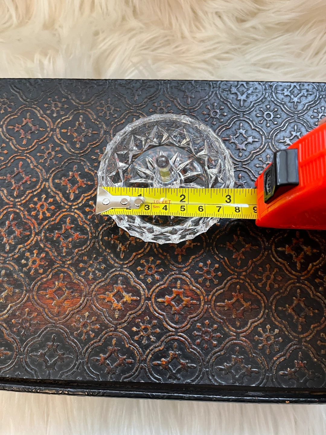 Selling a lovely crystal ring holder dish! It measures approximately 3.25 inches in diameter and stands about 2.5 inches tall. Perfect for keeping your rings safe and organized
