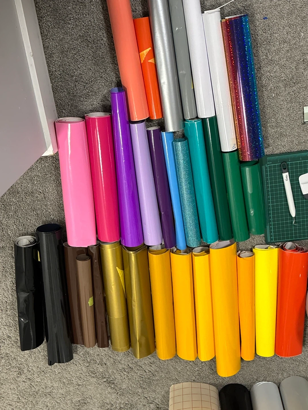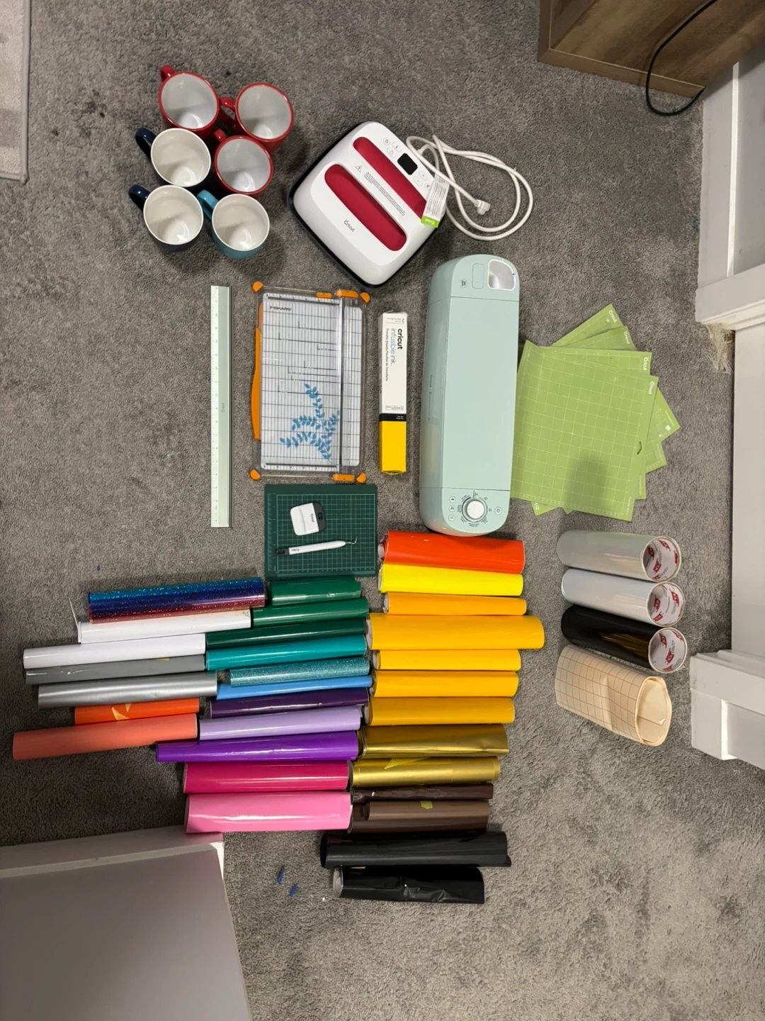Bundle includes Cricut EasyPress, Cricut Explore Air 2 cutting machine, and a large selection of vinyl rolls in various colours and finishes. Also includes mugs, a paper trimmer, ruler, and cutting mats. This set is great for crafters and DIY enthusiasts!