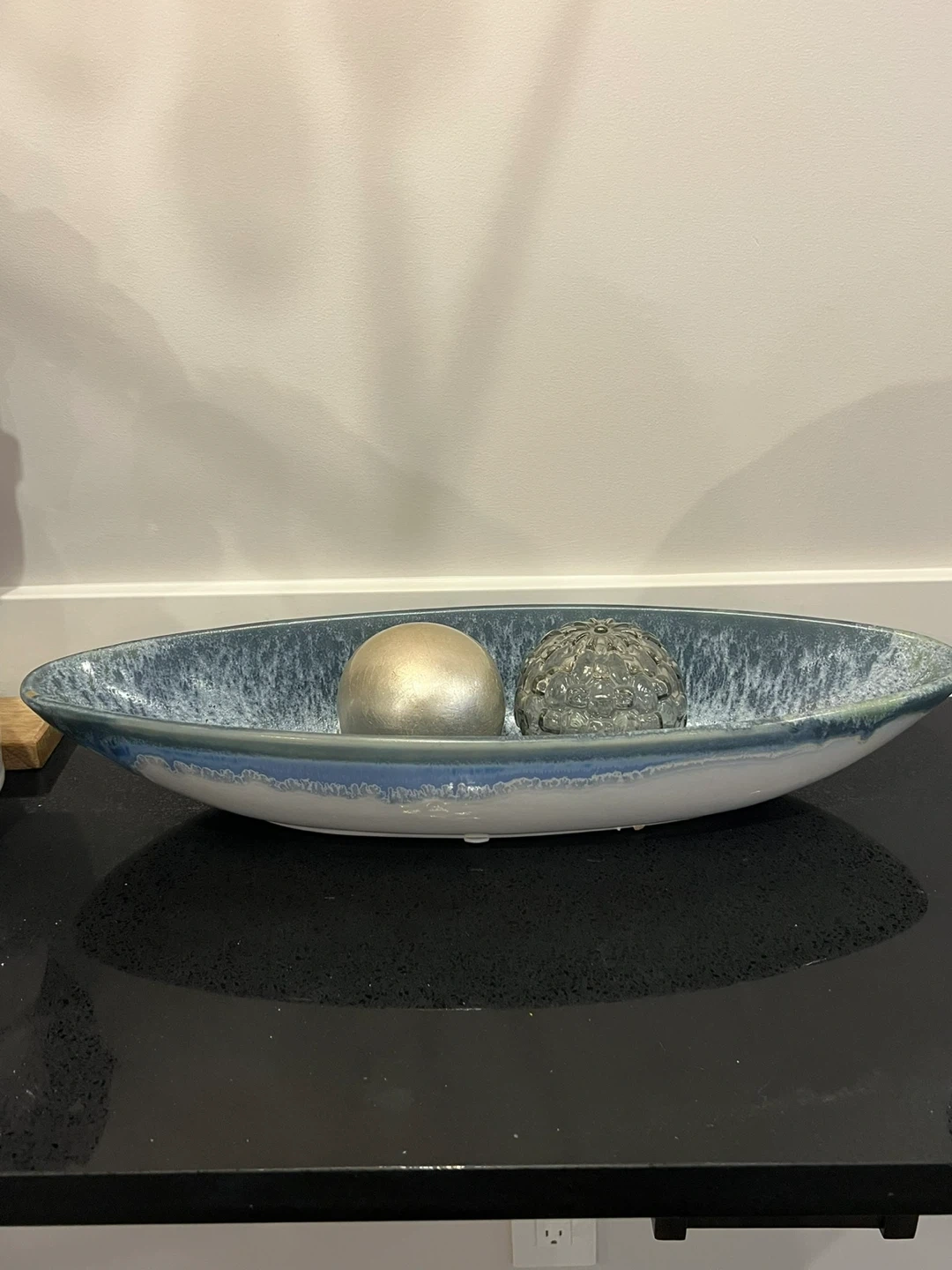 This is a long, oval decorative ceramic bowl with a blue speckled glaze on the rim and white interior. It includes two decorative orbs, one silver and one grey textured. It's a lovely piece for a table or shelf.
