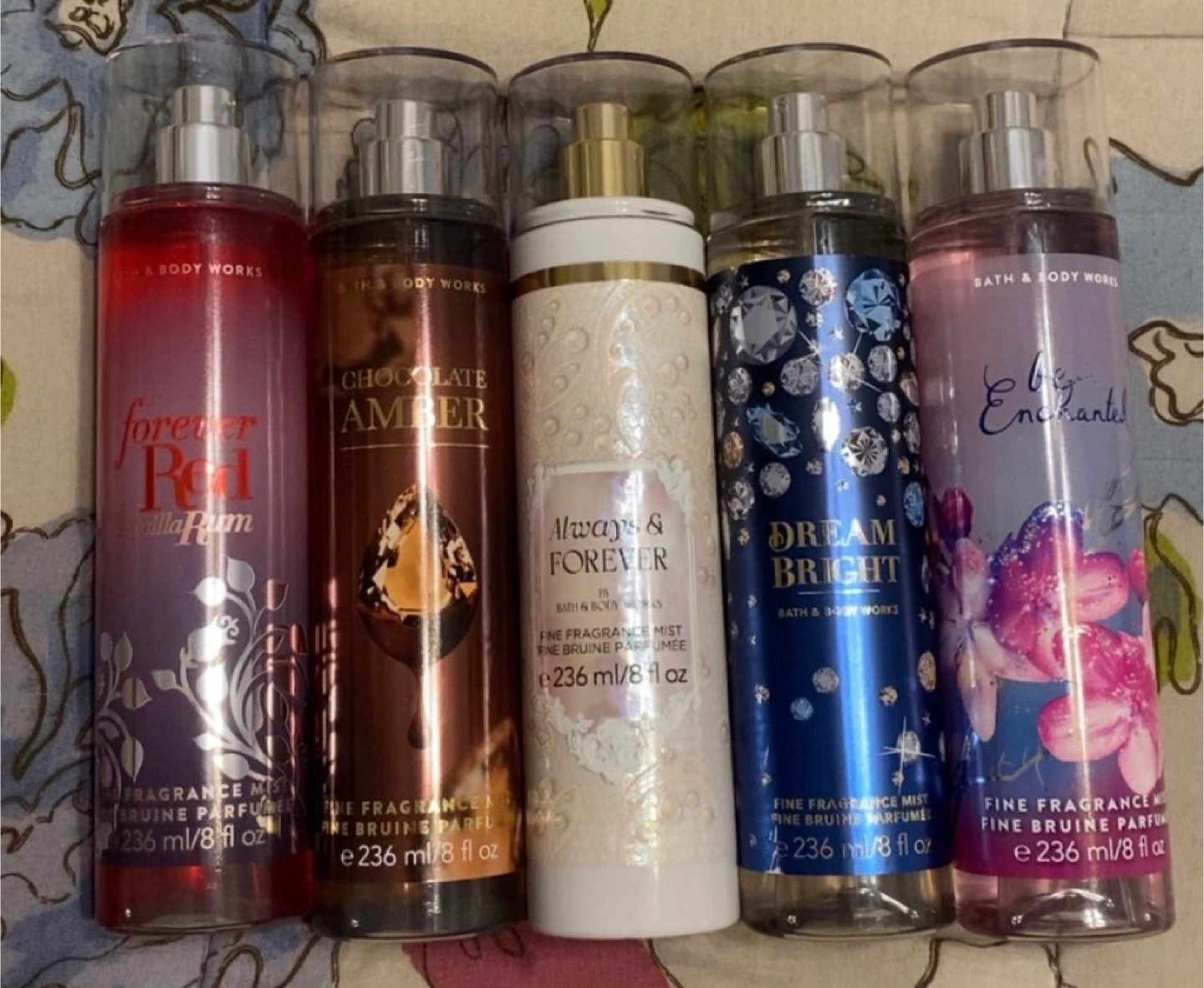 Selling a collection of Bath & Body Works fine fragrance mists! You'll get five scents: Forever Red Vanilla Rum, Chocolate Amber, Always & Forever, Dream Bright, and Be Enchanted. Each bottle contains 236 ml / 8 fl oz