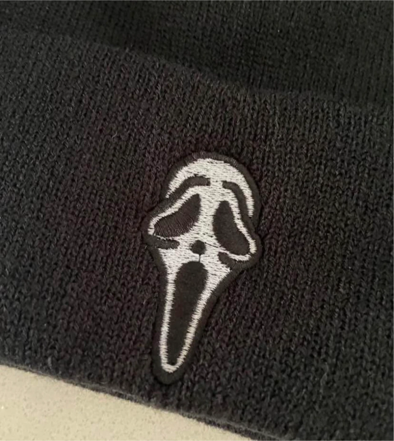 This black knit beanie features an embroidered Scream Ghostface mask logo