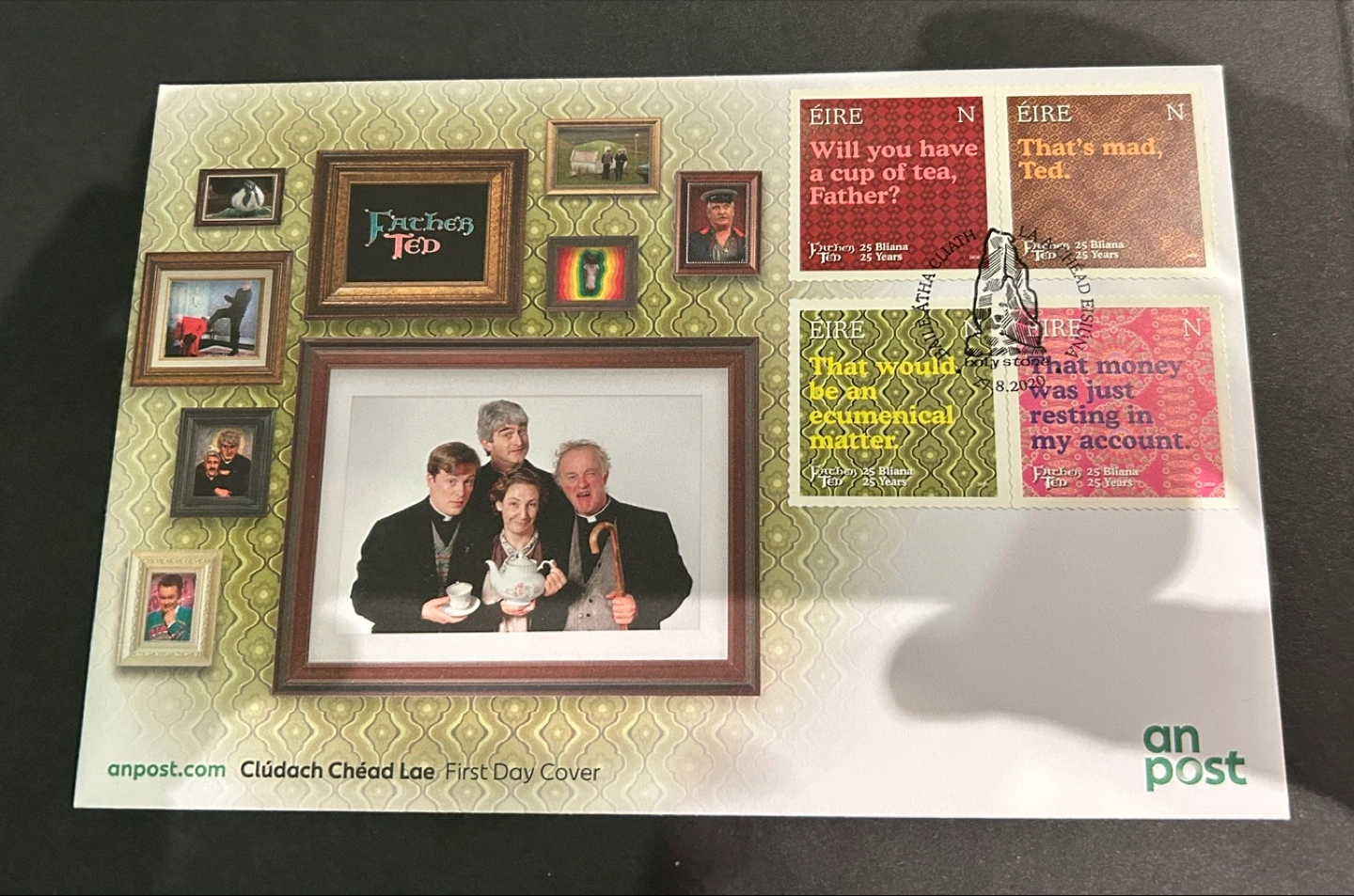 Selling a Father Ted First Day Cover from An Post. It features images and quotes from the show, including "Will you have a cup of tea, Father?" and "That's mad, Ted."