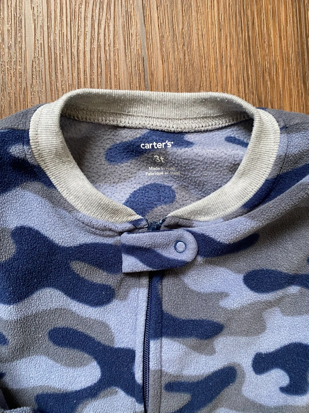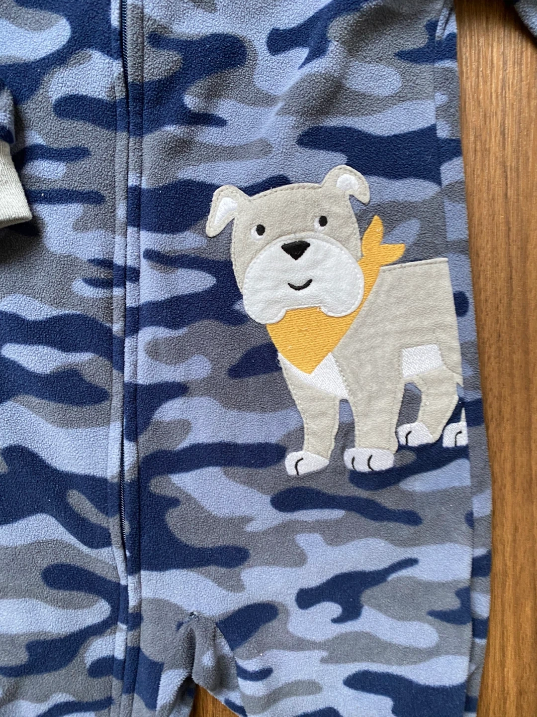Cozy Carter's fleece footed pajamas in a blue camouflage print. Features an adorable bulldog applique on the chest. Zipper front for easy on and off. Non-slip grips on the feet.
